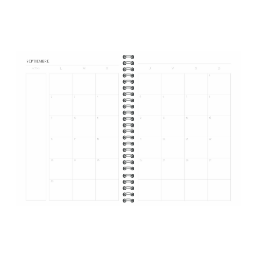 Agenda en blanco y negro (Septiembre-agosto) incluye calendarios 2024-2025, calendario mensual, planner semana vista y apartado de notas.