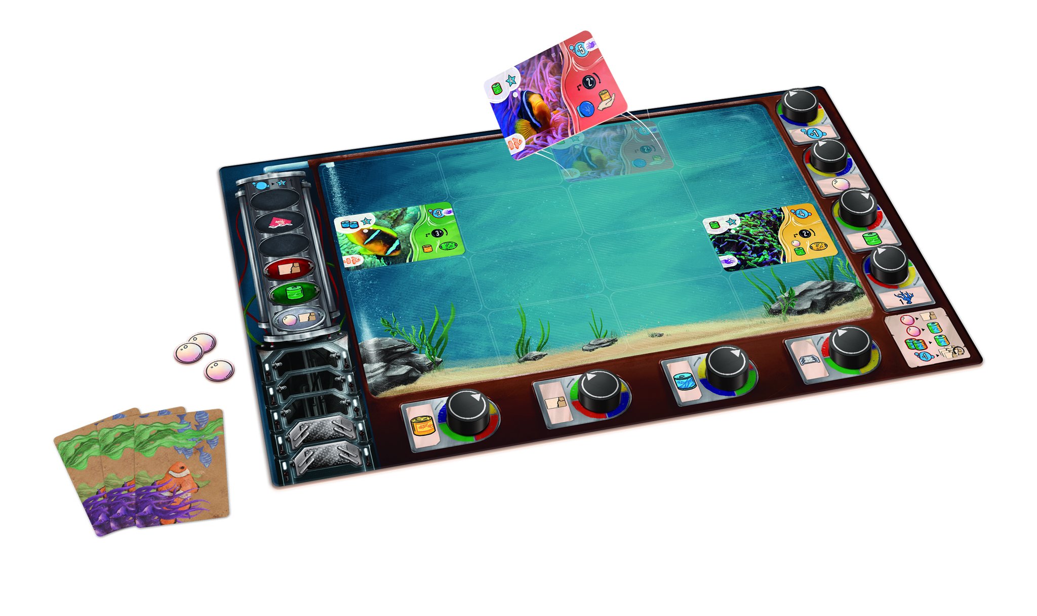 En Aquaria, los jugadores representan a miembros entusiastas de una sociedad de acuaristas, cada uno decidido a tener el mejor acuario del club. Cuidan de su acuario, que alberga diversos tipos de peces y plantas acuáticas. A lo largo de la partida , comprarán peces nuevos, los alimentarán y mantendrán sus acuarios en perfectas condiciones, controlando la microflora, el nivel de oxígeno y el agua en perfectas condiciones gracias al filtro. También demostrarán su progreso en sus estudios de acuariofilia con sus avances en el marcador de la Enciclopedia, donde pueden conseguir los conocimientos necesarios para poder incluir un valioso pez león en tu acuario y con ello obtener una recompensa en forma de muchos puntos de victoria.