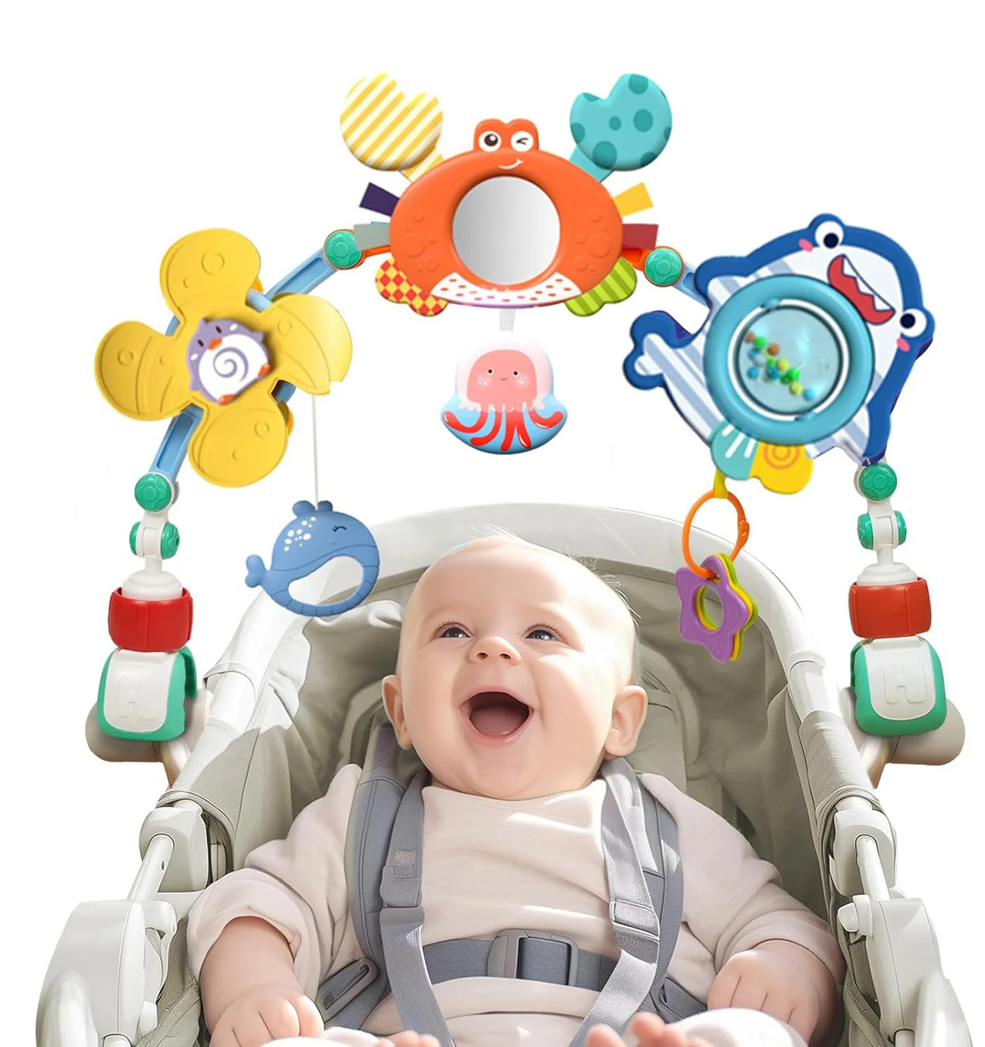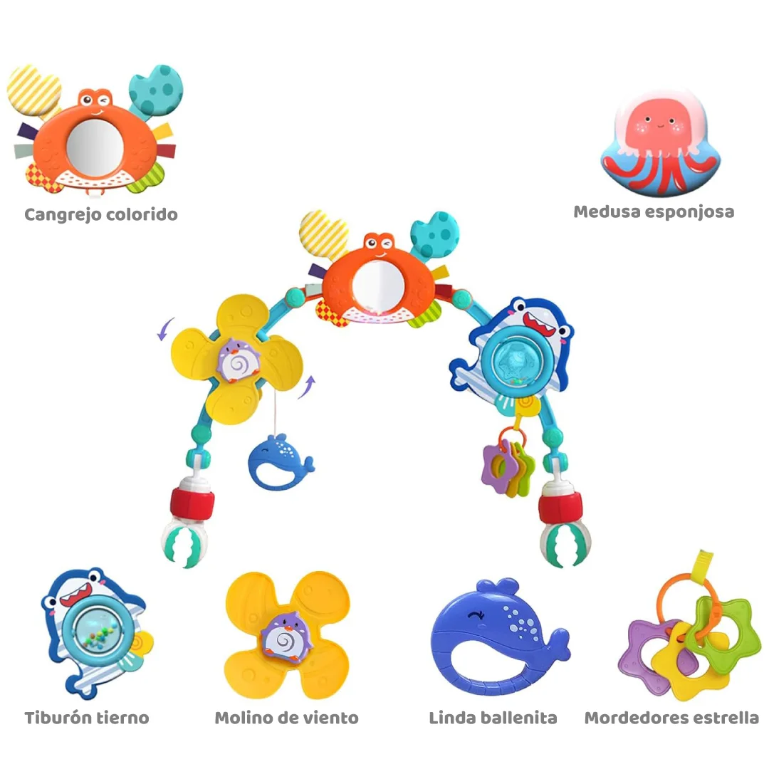 - ¡Haz que cada paseo sea una aventura con nuestro arco de juego para bebés! Este accesorio es perfecto para el cochecito o asiento de auto, con un encantador tema de animales que incluye un molino de viento con forma de pingüino, un tiburón juguetón y mordedores de estrellas.