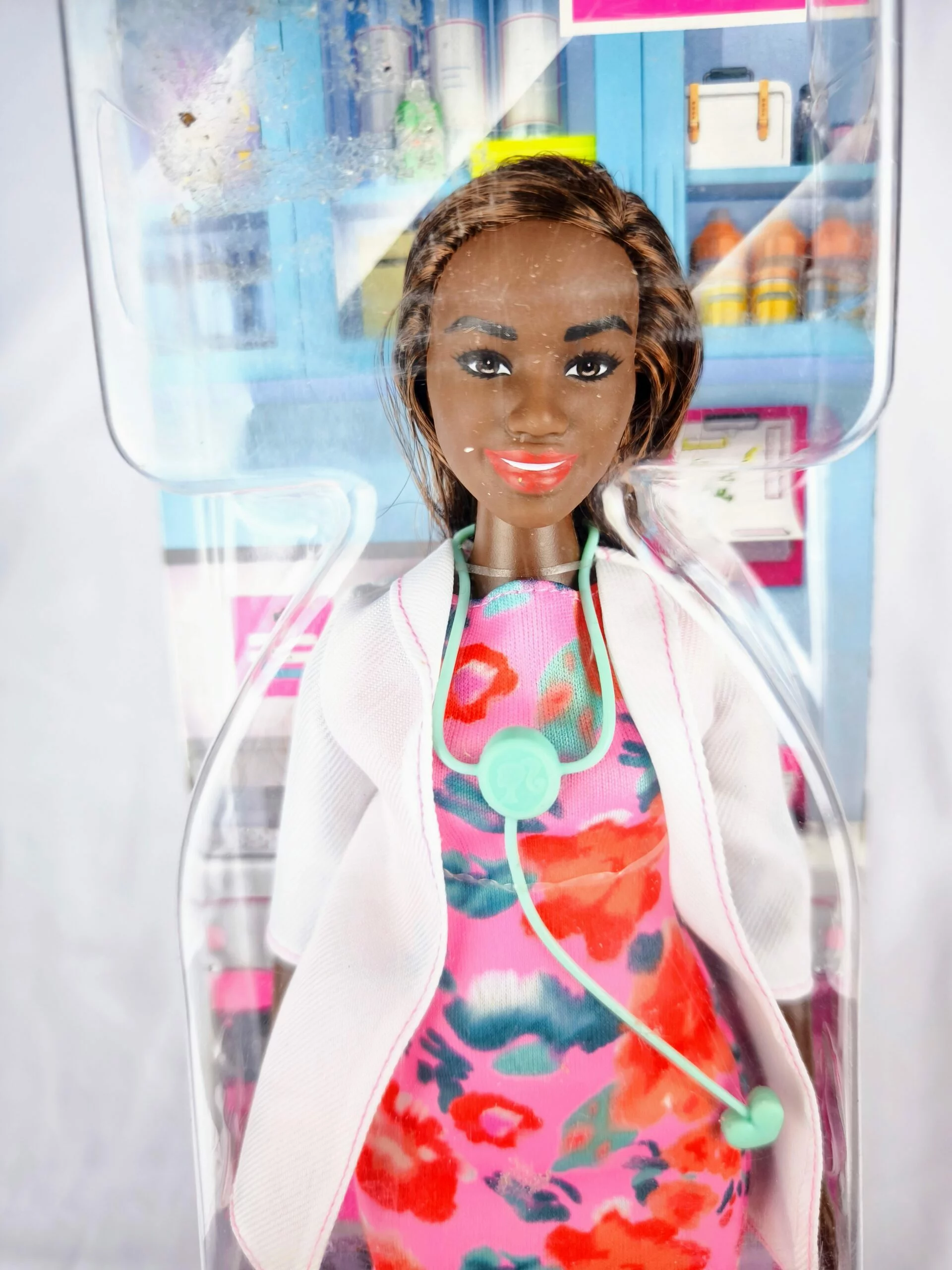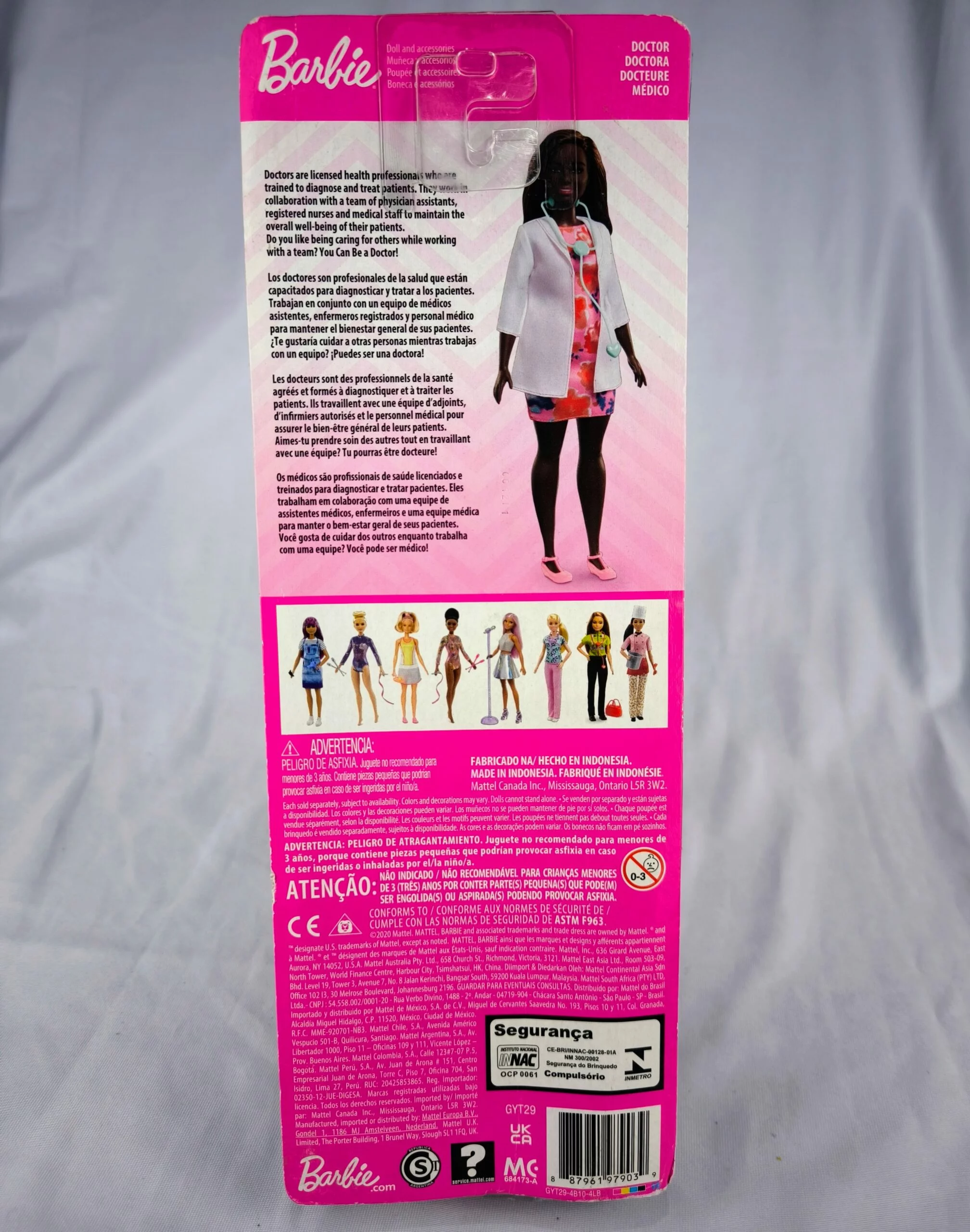 La muñeca viene con accesorios adicionales como un pequeño exam table y un conjunto de herramientas médicas, lo que permite a los niños imaginar y jugar escenarios de cuidado médico. El empaque original presenta imágenes de Barbie en su atuendo de doctor, destacando la diversidad y la inclusión en la colección.