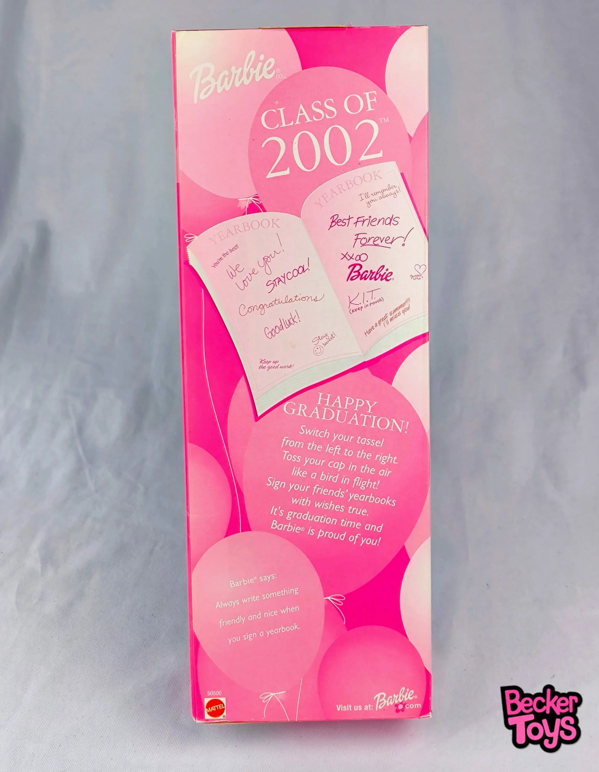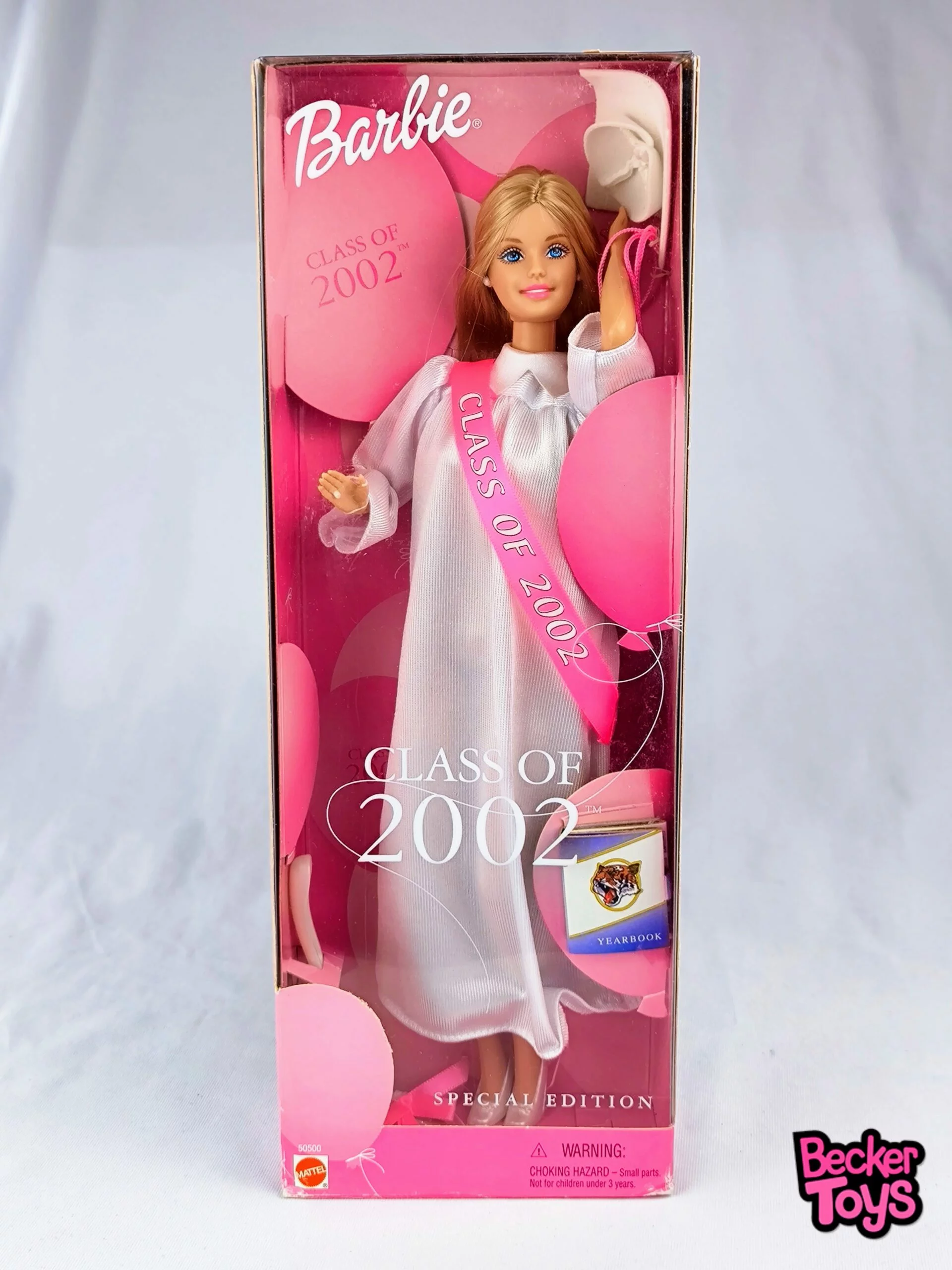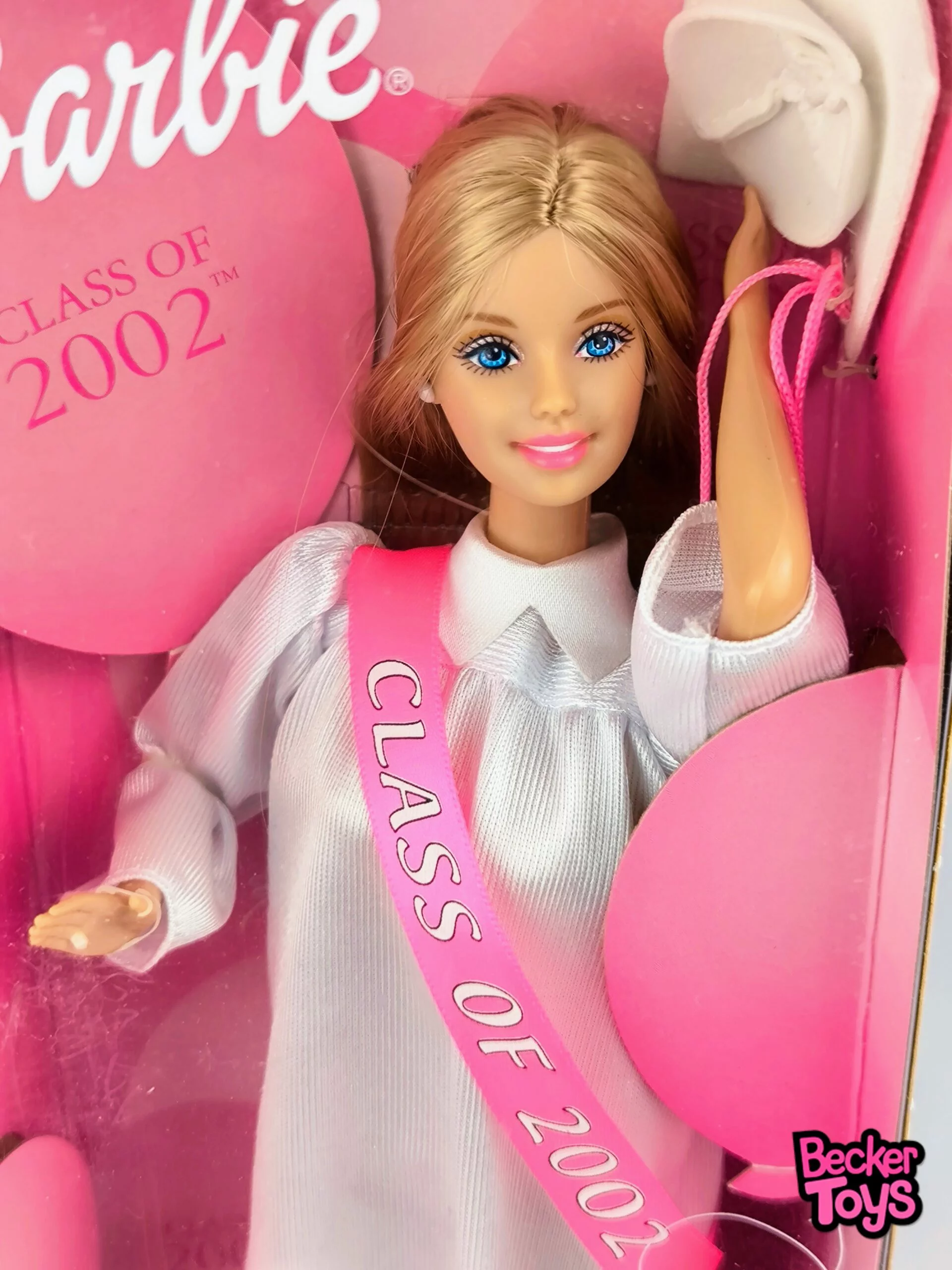 Barbie Class of 2002 es una edición especial que celebra el logro académico y la emoción de la graduación. Esta muñeca luce una toga blanca con detalles rosas y un birrete a juego, simbolizando el orgullo y la tradición de este importante evento. Además, incluye un diploma y un anuario en miniatura, lo que añade un toque realista y nostálgico.
