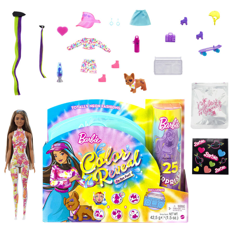¡Toma la muñeca Barbie Color Reveal, parcialmente cubierta con una capa de tinte neón y pélala para revelar el look! A continuación, abra las bolsas misteriosas para encontrar un cachorro mascota, un estuche transparente con forma de boombox y arena viscosa, una patineta para cachorros, patines de ruedas, ropa teñida con nudos, una muñeca, una hoja de calcomanías y dos extensiones de cabello, una para la muñeca Barbie y otra de tamaño para que los niños usen.