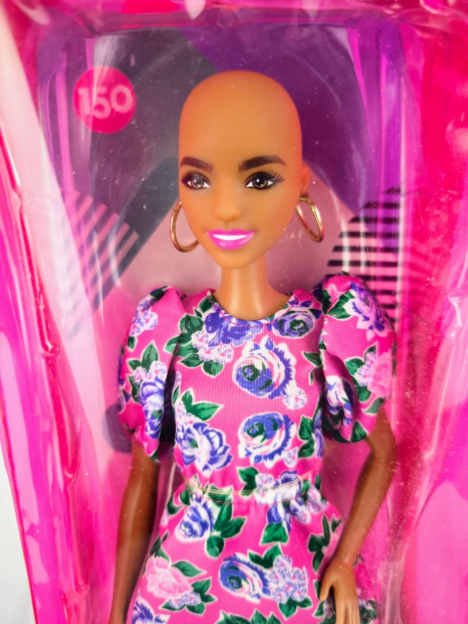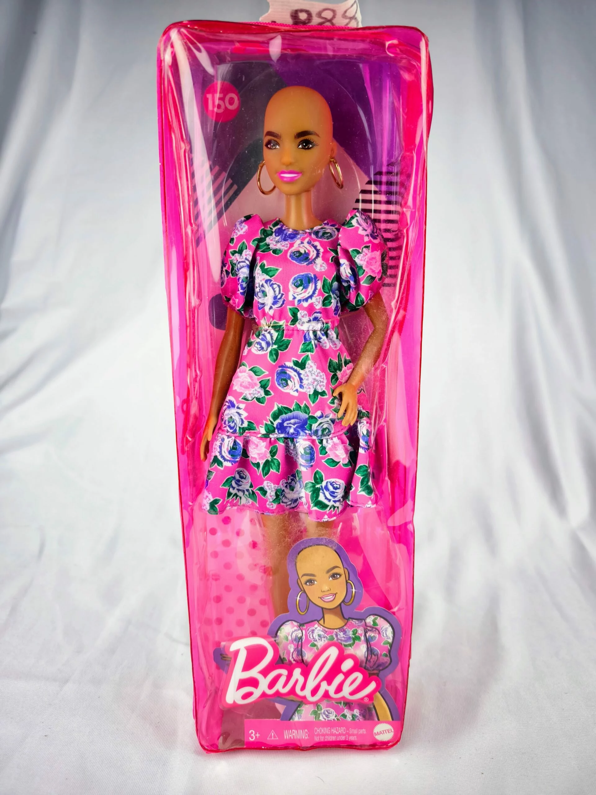 Barbie Fashionista 150 (2020) es una muñeca de moda de 30 cm fabricada por Mattel como parte de la colección Fashionistas. Esta Barbie tiene un aspecto sin pelo y lleva un vestido floral rosa con un patrón colorido y mangas hinchadas. Los botines blancos y unos pendientes de aro dorado completan su atuendo.