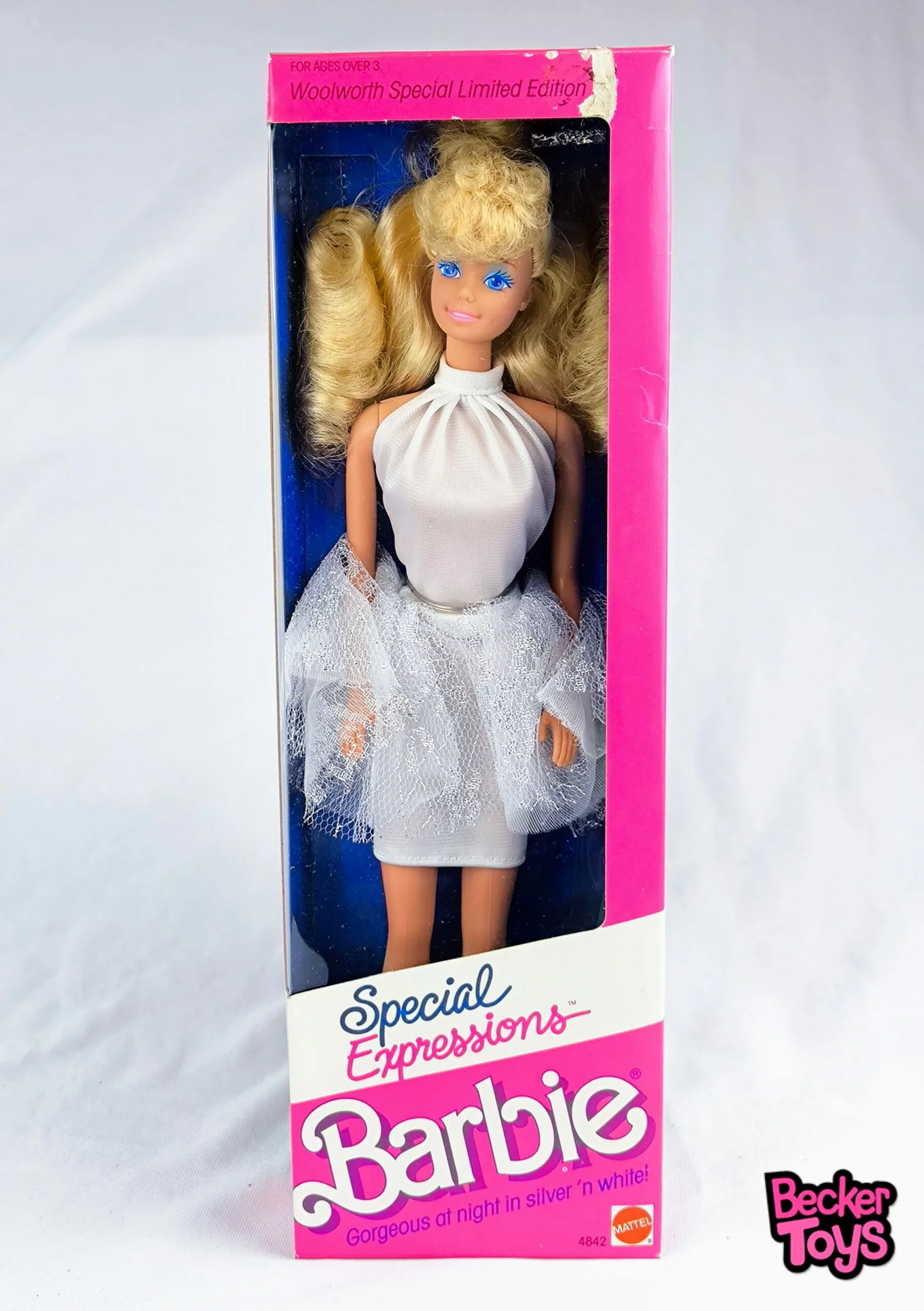 Barbie Special Expressions de 1989 es una edición limitada exclusiva de Woolworth, diseñada para destacar por su elegancia y estilo. Esta muñeca viene vestida con un conjunto blanco y plateado, que incluye una falda de tul y detalles brillantes, ideal para lucir espectacular en eventos nocturnos. El empaque original resalta su exclusividad, con frases como «Gorgeous at night in silver ‘n white!» y el número de modelo 4842.