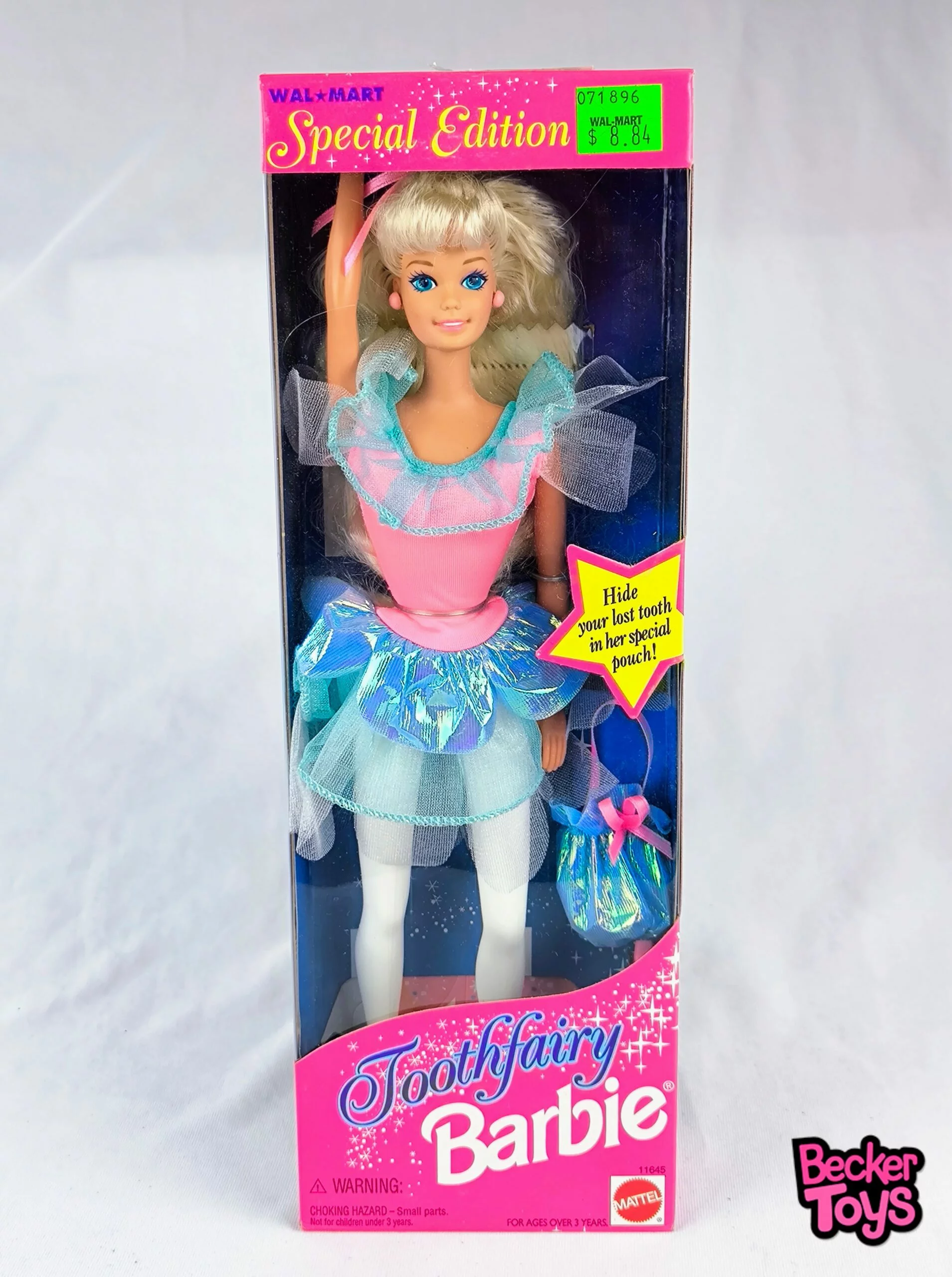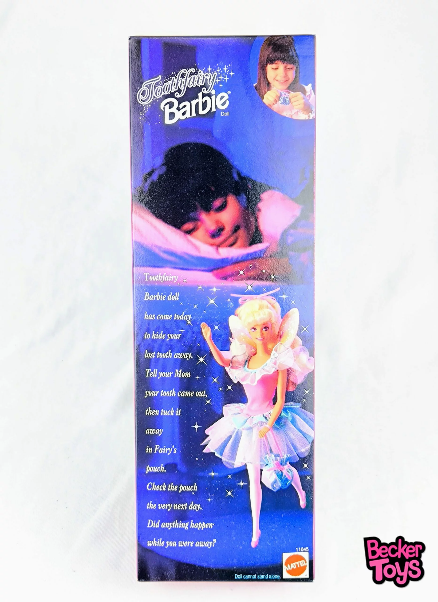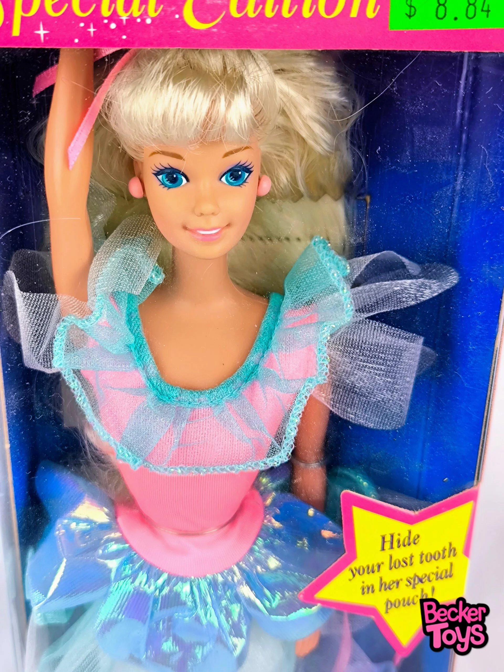 La Barbie Toothfairy de 1994 es una edición especial que captura la magia y la fantasía del hada de los dientes. Esta muñeca está vestida con un vestido fruncido en tonos púrpura y rosa, acompañado de medias blancas.