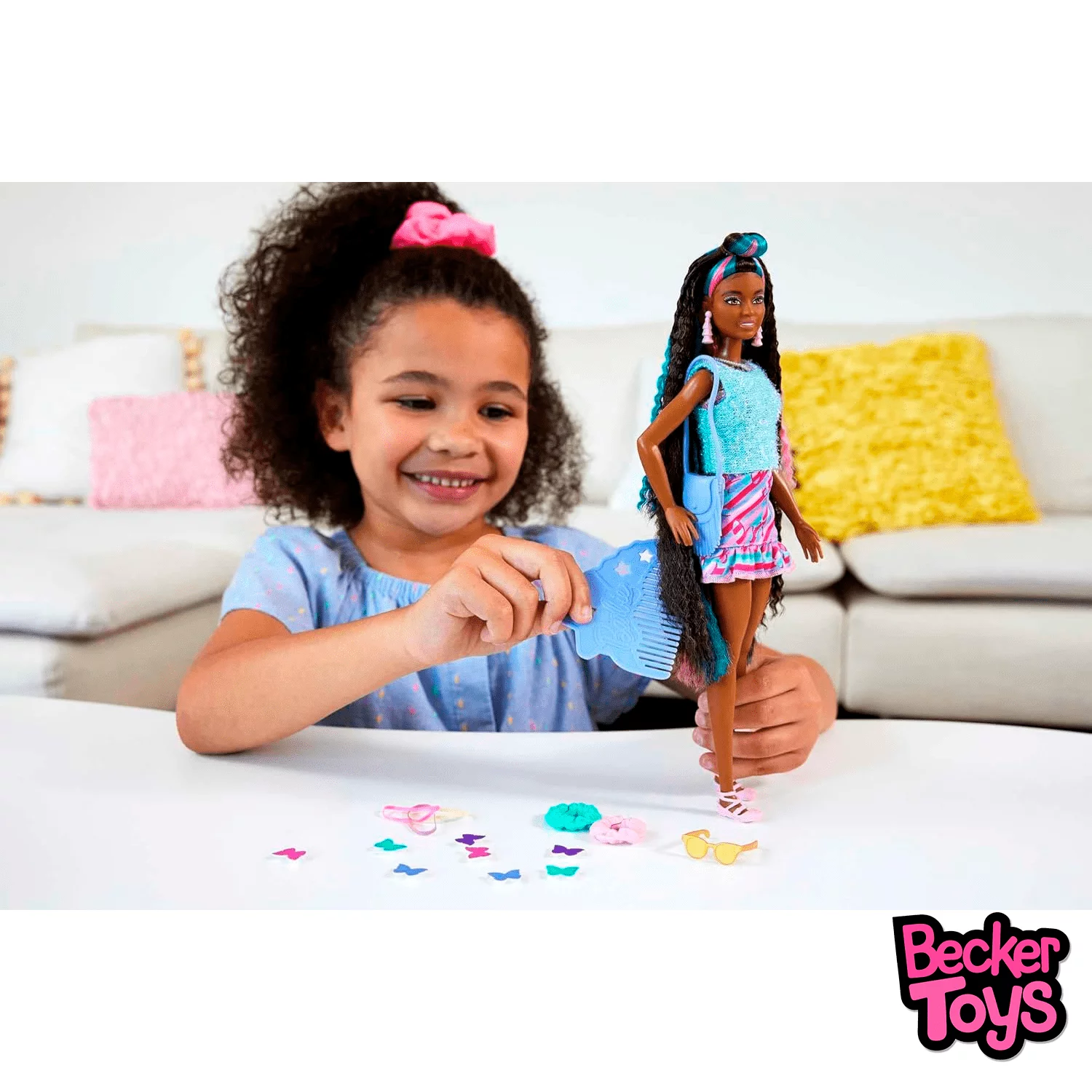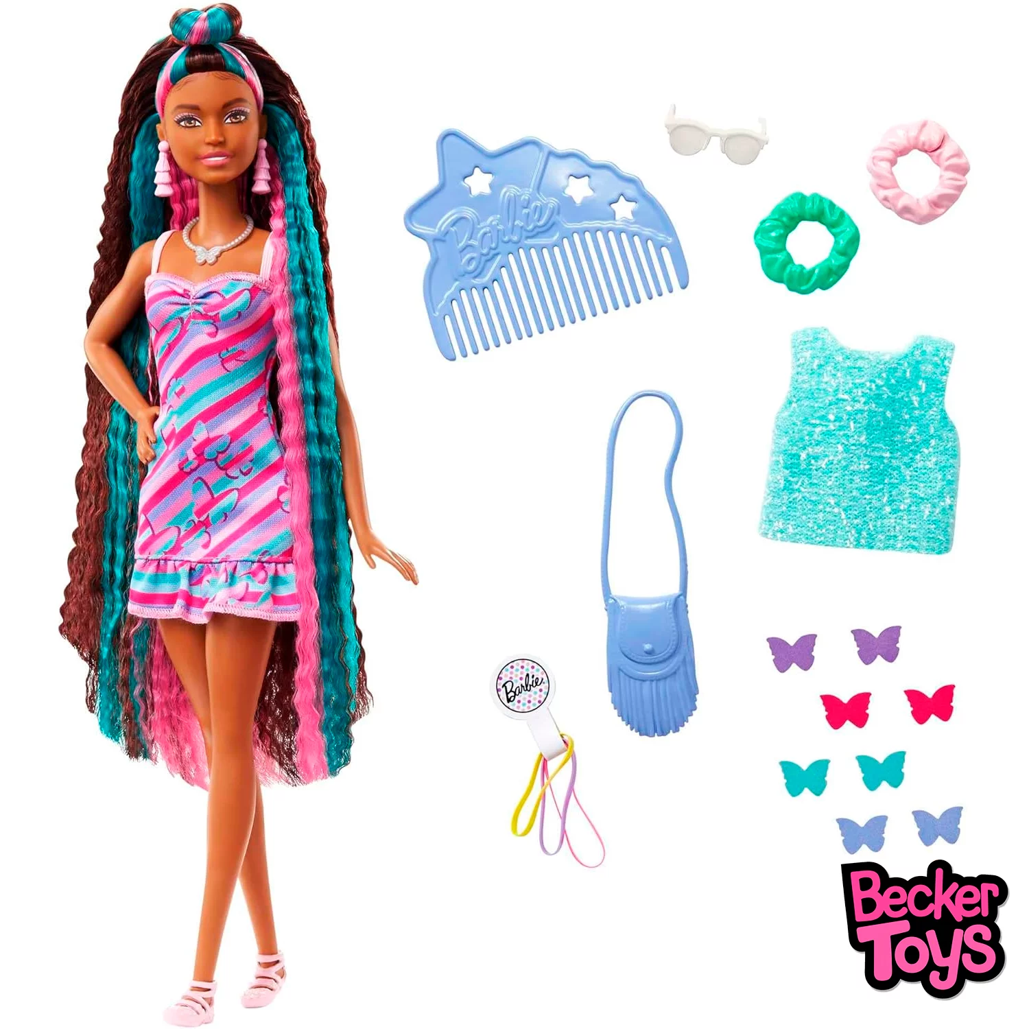 La Barbie Totally Hair con aspecto de mariposa es una muñeca inspirada en la icónica Barbie Totally Hair que se lanzó hace 30 años. Esta versión moderna presenta más de 20 cm de cabello extra largo y jugable, con mechas rosas y azul cian a lo largo de su pelo ondulado, complementado con un medio moño.