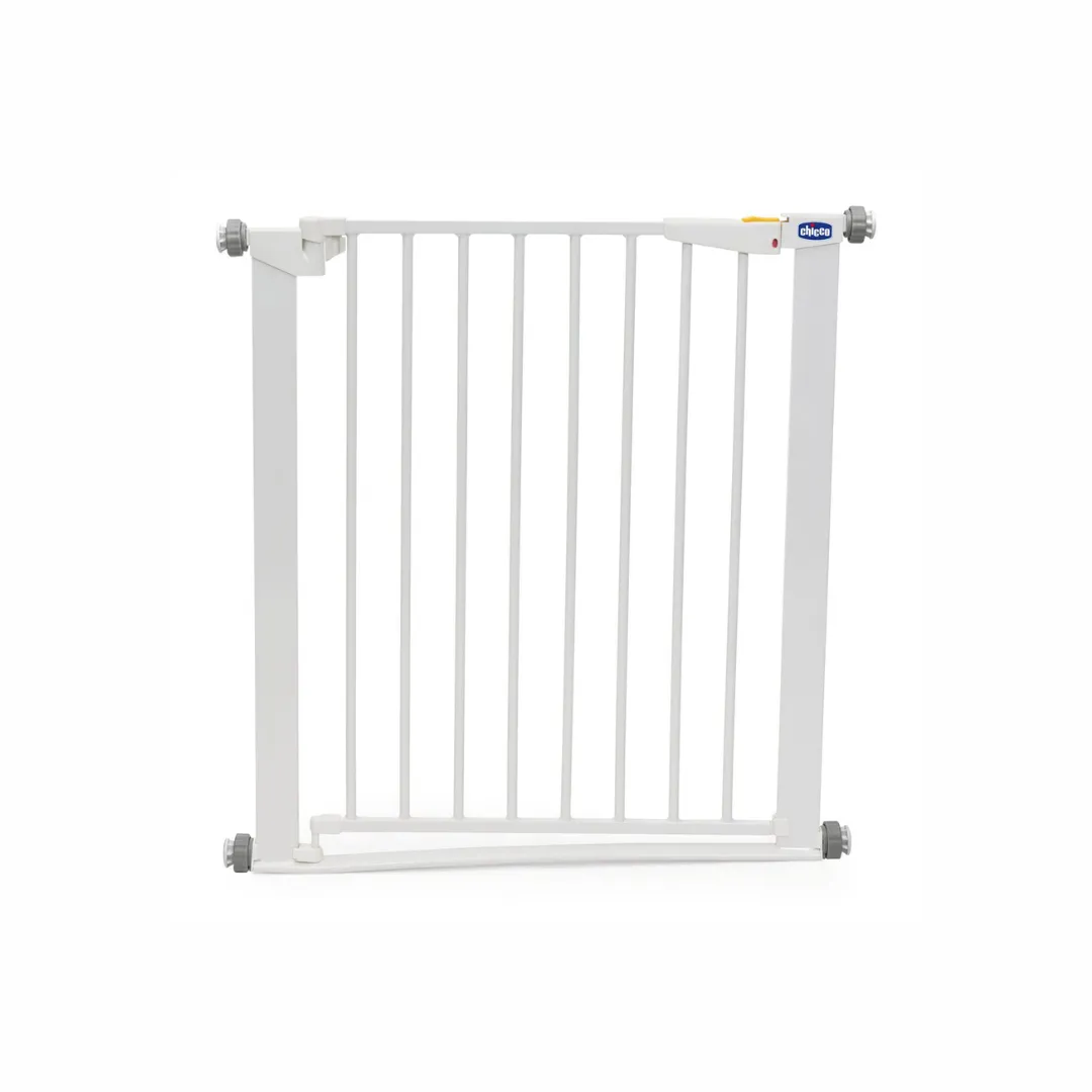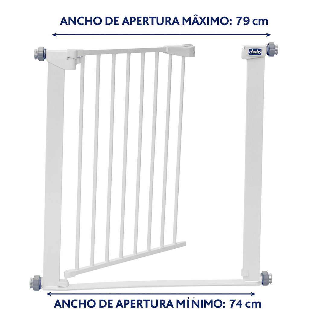 Con un ancho regulable entre 74 cm y 79 cm, permite una instalación ajustada y segura en diferentes espacios. Cuenta con un sistema de cierre automático y un doble dispositivo de apertura de seguridad, garantizando que el niño no pueda abrirla fácilmente. Instalación rápida gracias a cinta de doble cara y tornillos incluidos.