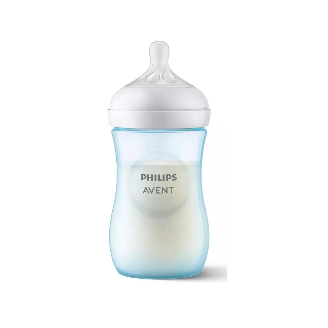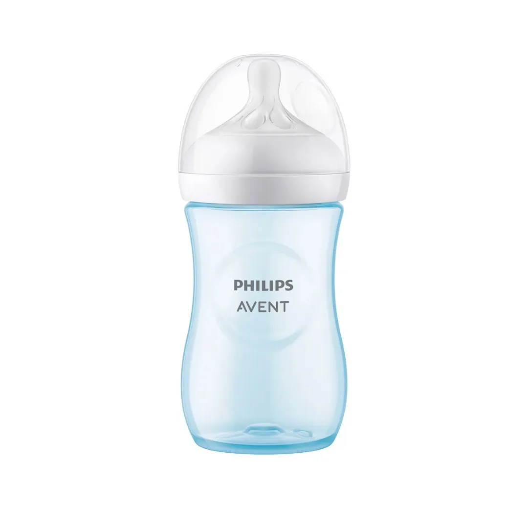 Biberón Philips Avent Natural Response de 240ml en color Azul, con tetina Flow 3 que imita la lactancia materna. Sistema anticólicos y diseño seguro, libre de BPA.