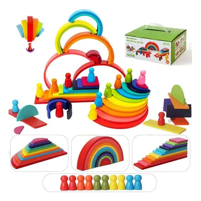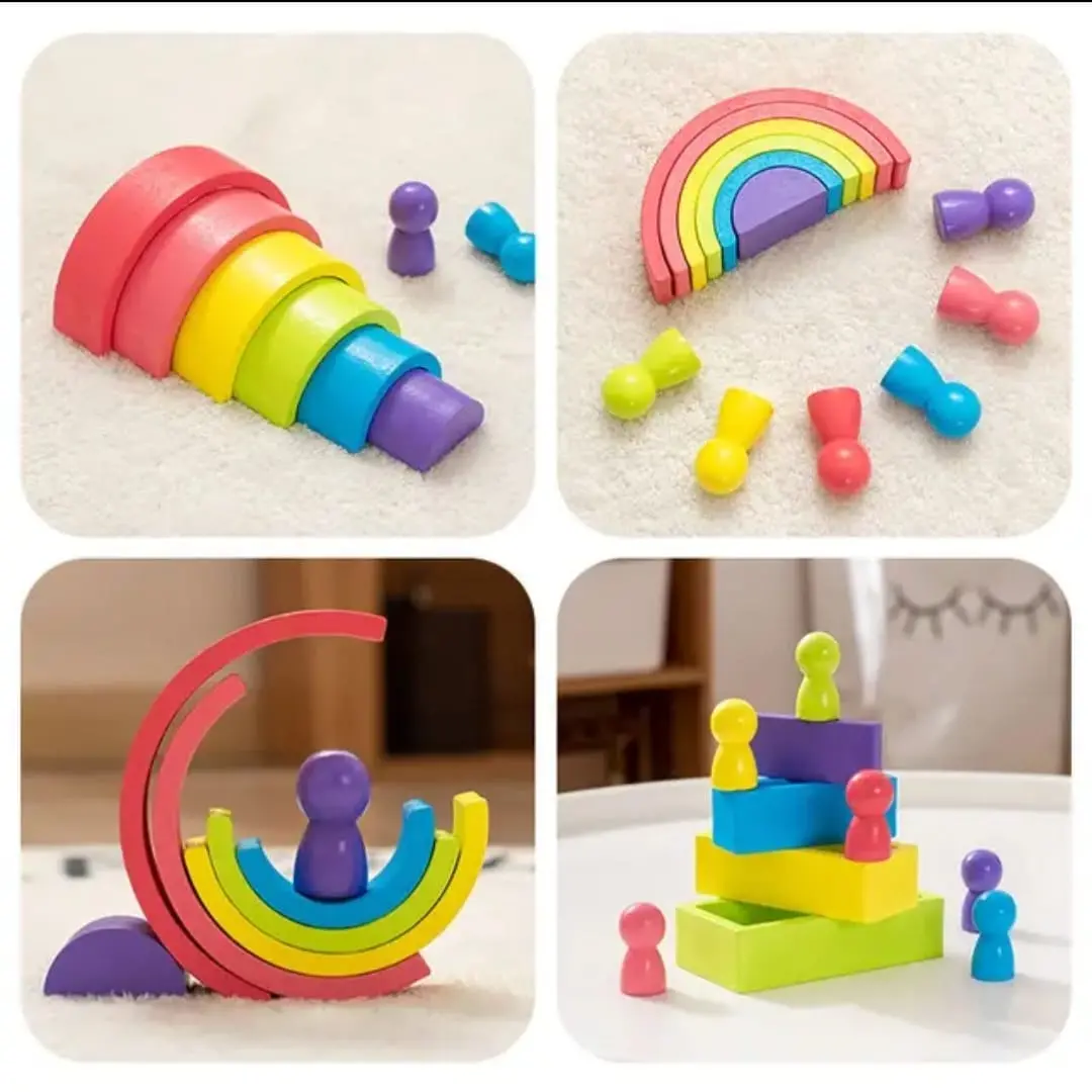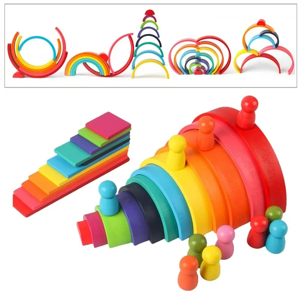 Elementos incluidos: El juego Montessori Rainbow Stacker incluye 4 tipos de formas: 12 bloques de arco, 11 bloques de construcción semicirculares, 11 bloques de construcción rectangulares y 11 piezas de hombrecitos de madera.