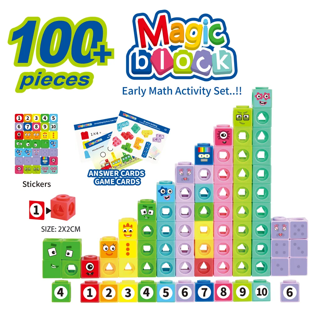Elementos incluidos: 100 bloques de encaje y 1 cartilla de retos matemáticos