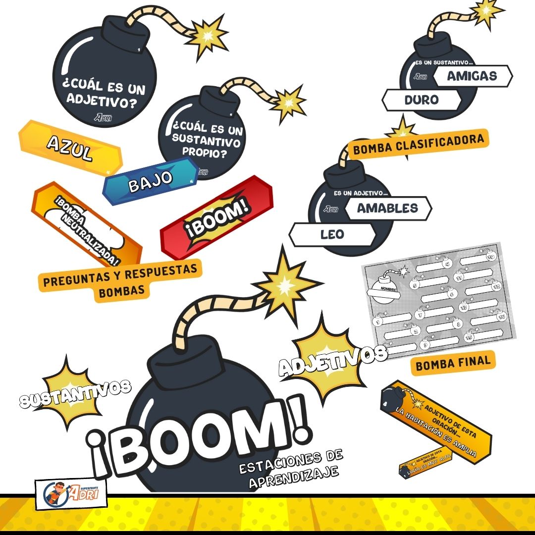 💣 Preguntas y respuestas en bombas: más de 40 preguntas expresadas en bombas sobre los sustantivos y sus clases y los adjetivos y sus grados. Además estas preguntas tienen 5 opciones, con el fin de similar lo característico de este juego, los alumnos deberán de ir descartando las respuestas que no son correctas y darlas la vuelta ya que por la parte trasera pondrá «bomba neutralizada» en el caso de que sea la repuesta que tienen que descartar y «¡boom!» en el caso de que sea la respuesta correcta y por lo tanto la que no tenían que descartar.