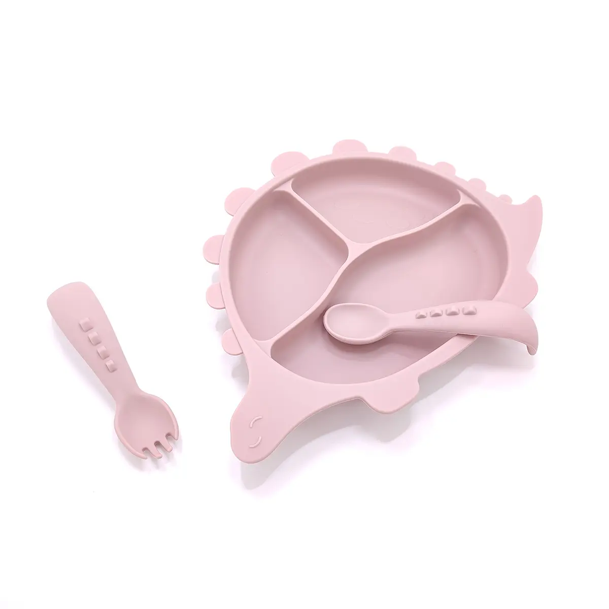 1 Plato de silicona 3 divisiones dino, 1 Bolw de silicona dino, 1 Babero de silicona, 1 vaso de silicona con tapa y cañita honey, 1 tapa porta snack, 1 set de cubiertos de silicona cuchara y tenedor dino.