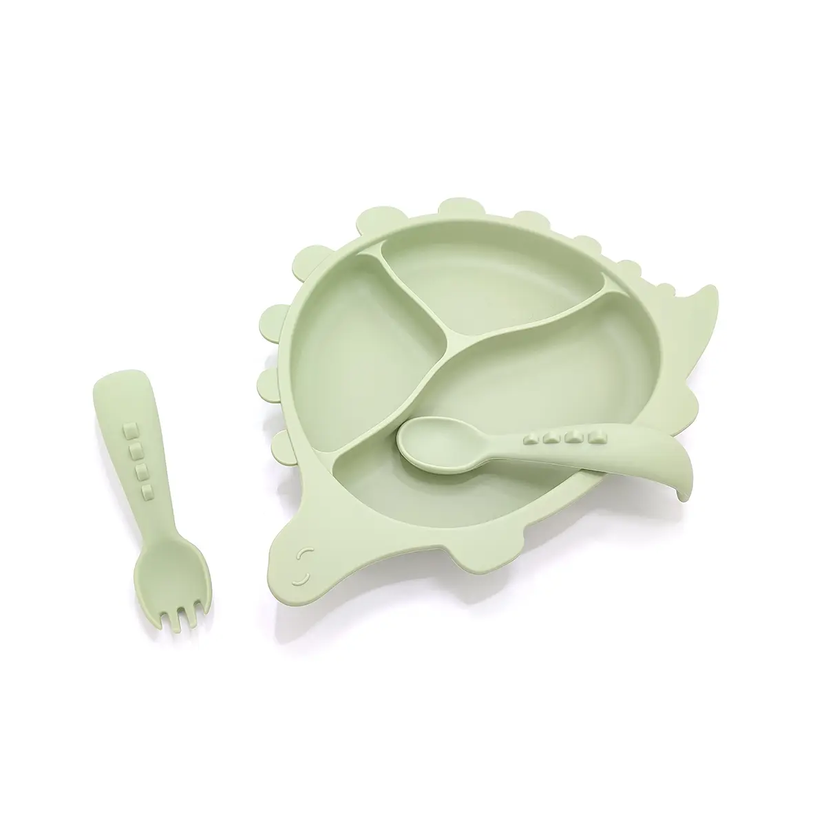1 Plato de silicona 3 divisiones dino, 1 Bolw de silicona dino, 1 Babero de silicona, 1 vaso de silicona con tapa y cañita honey, 1 tapa porta snack, 1 set de cubiertos de silicona cuchara y tenedor dino.