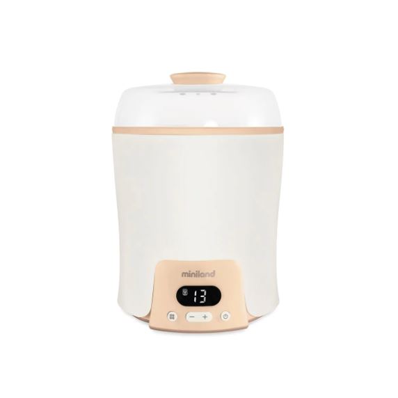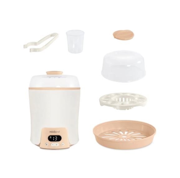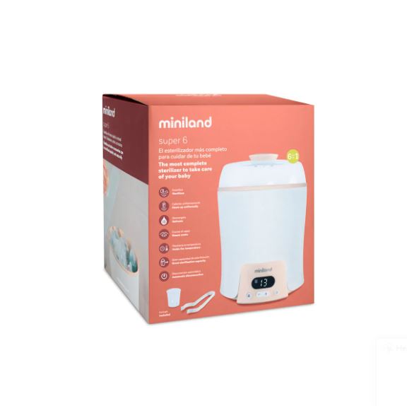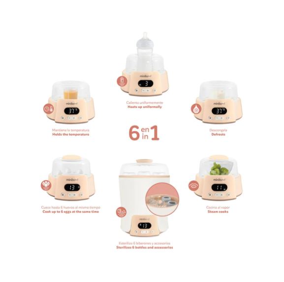 El Super 6 de Miniland es un dispositivo multifunción 6 en 1 que facilita el día a día de las familias. Permite esterilizar, calentar, descongelar, cocinar al vapor y mantener la temperatura de biberones y potitos , además de cocer hasta 6 huevos en pocos minutos. Todo en un solo aparato compacto, práctico y con pantalla digital con temporizador y apagado automático . Una solución completa para ahorrar tiempo y espacio en casa.