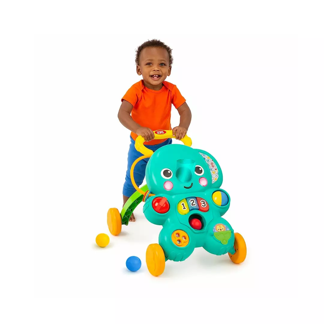¡Siéntate y juega o empuja y camina con el andador Stroll ‘n Roll de Bright Starts! Este juguete andador 2 en 1 crece con el desarrollo de su hijo para brindarle a su familia años de alegría. Cuando se usa como juguete para el piso, hay muchas actividades para captar la atención de su bebé. ¡Prepárate para divertirte con la caída de bola interactiva con trompa de elefante! El bebé practicará habilidades motoras finas dejando caer bolas en la trompa del elefante, activando luces y sonidos. Las grandes teclas del piano, fáciles de presionar, cuentan hasta 1, 2, 3 con sonidos divertidos de presionar y tocar e introducción de colores. ¡Cucú! Gira la bola multicolor para obtener una sorpresa divertida. O voltea y ve amigos de safari ocultos. La escalera de cuentas móvil, el dial de juguete y el trinquete giratorio fomentan la motricidad fina. Baila al ritmo de más de 70 canciones, sonidos y refranes en 3 idiomas. A medida que el bebé crece, este juguete para sentarse y jugar también sirve como juguete para empujar. Practique caminar temprano con más ánimo en cada paso. Sabrás que tu bebé se está estirando de nuevas maneras… ¡simplemente sabrá que se está divirtiendo!