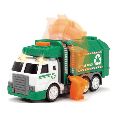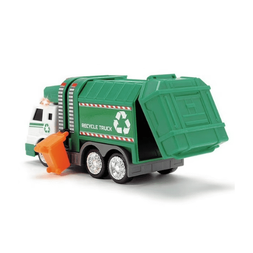 Camión de reciclaje Dickie Toys con diseño realista, ruedas móviles y detalles interactivos, ideal para enseñar a los niños sobre reciclaje mientras juegan.