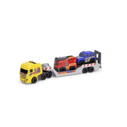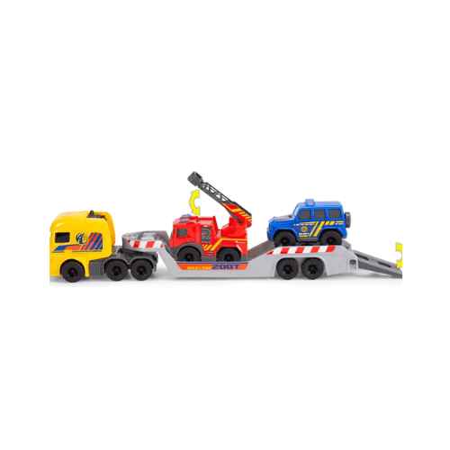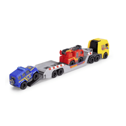 Micro Rescue Truck de Dickie Toys, un set 3‑en‑1 con camión transportador y dos vehículos de rescate (bombero y policía) listos para juego imaginativo.