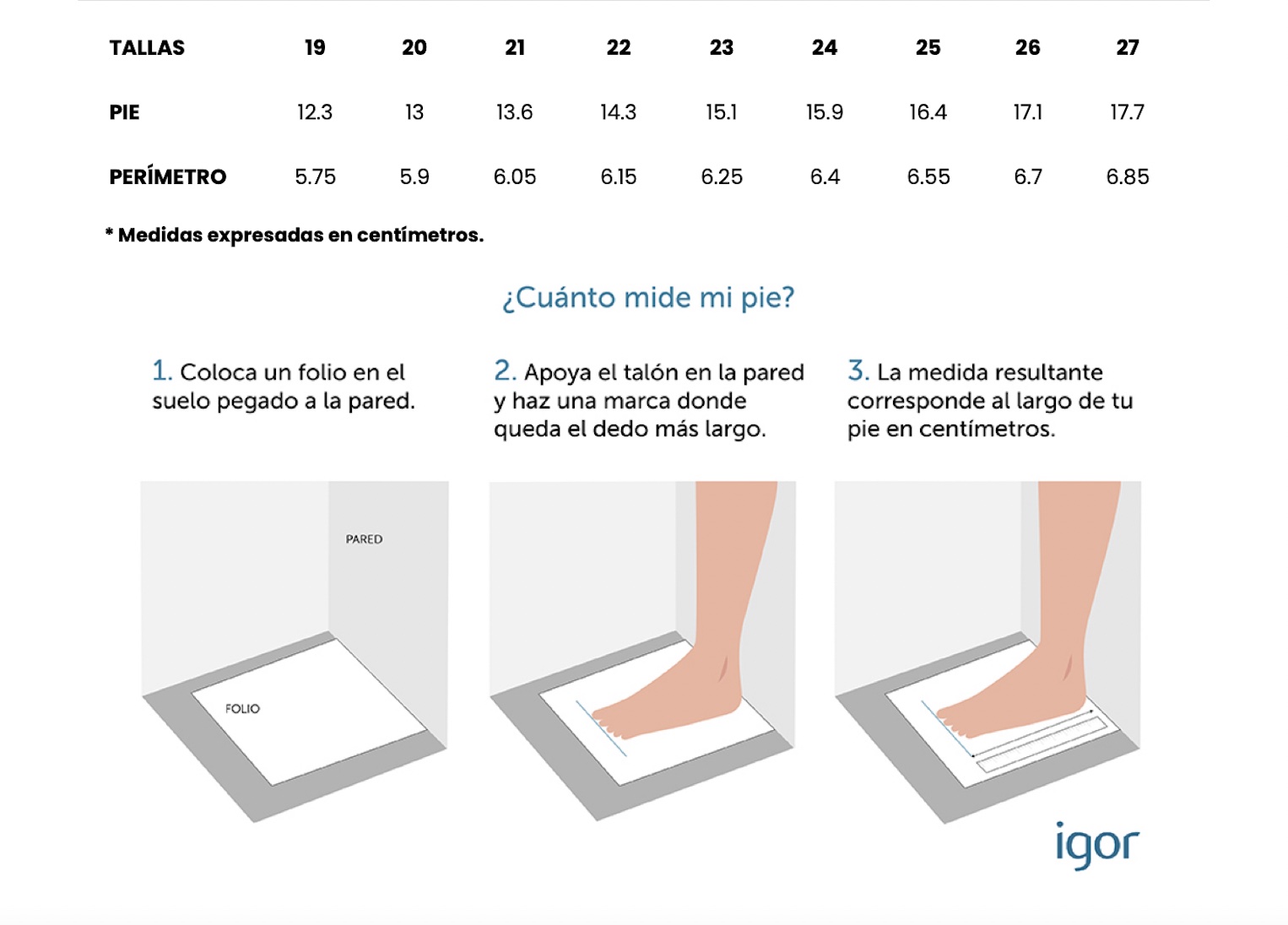 Elige la talla que necesita tu peque de las Cangrejeras Igor Clásicas con la Guía de Tallas.