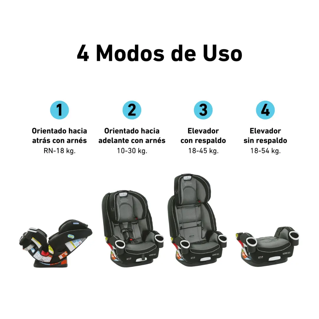 - Versatilidad 4 en 1: Úsala como asiento trasero para recién nacidos, luego en posición delantera, pasando a un booster con respaldo alto y finalmente a un booster sin respaldo.