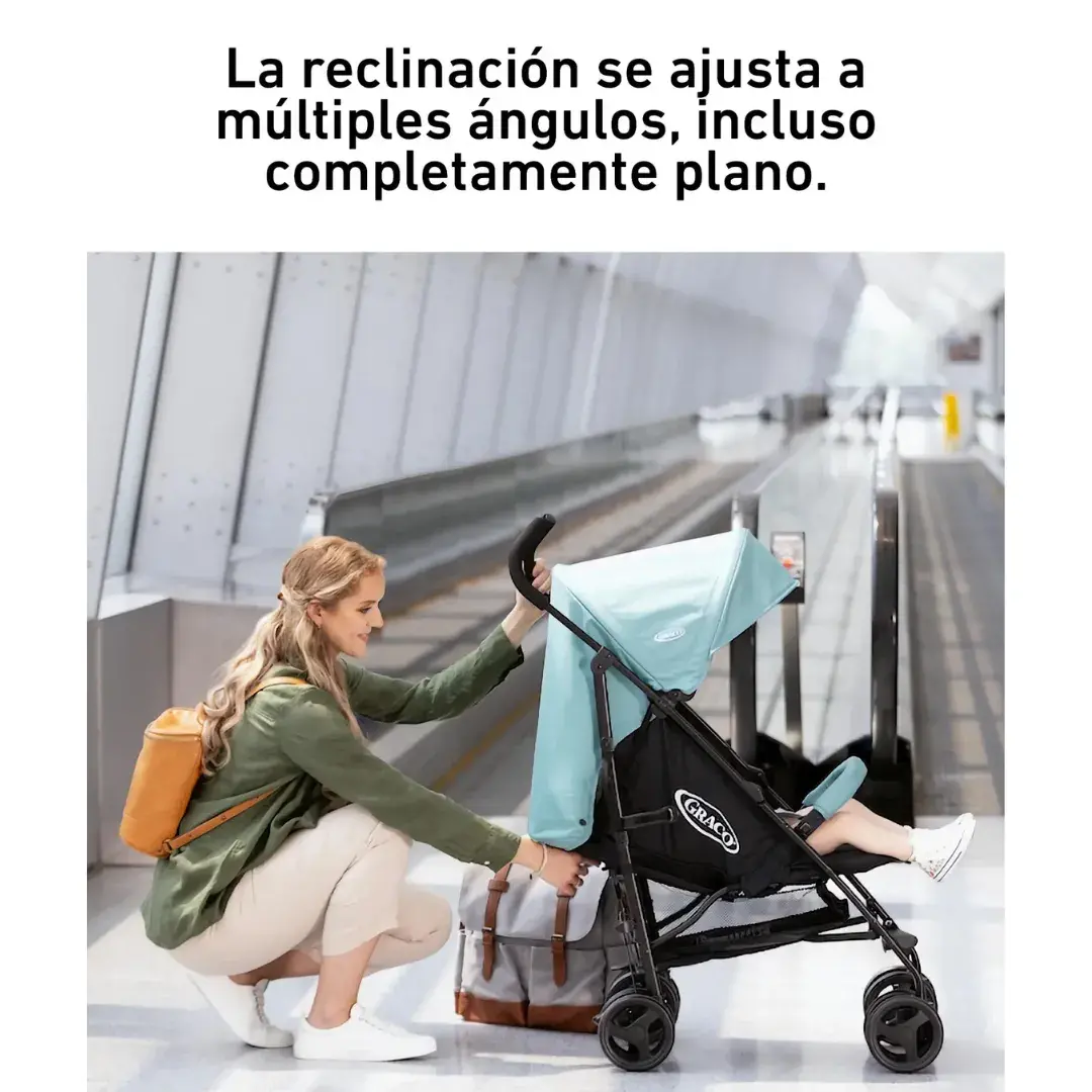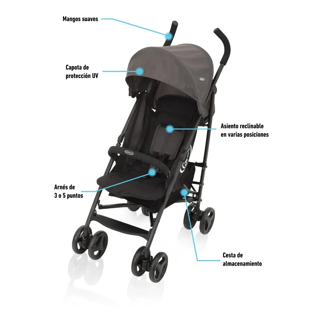 - Para la comodidad de tu pequeño, tiene un reclinado en múltiples posiciones, soporte para pies ajustable y una amplia capota que lo protege del sol.