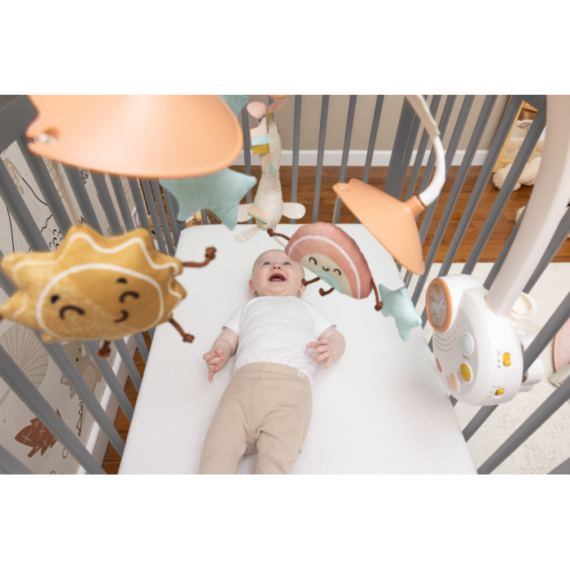 Además, este móvil musical para bebé crece junto a tu pequeño: puede transformarse fácilmente de un móvil de cuna con luces a una caja de música independiente, perfecta para acompañar las diferentes etapas del desarrollo infantil.