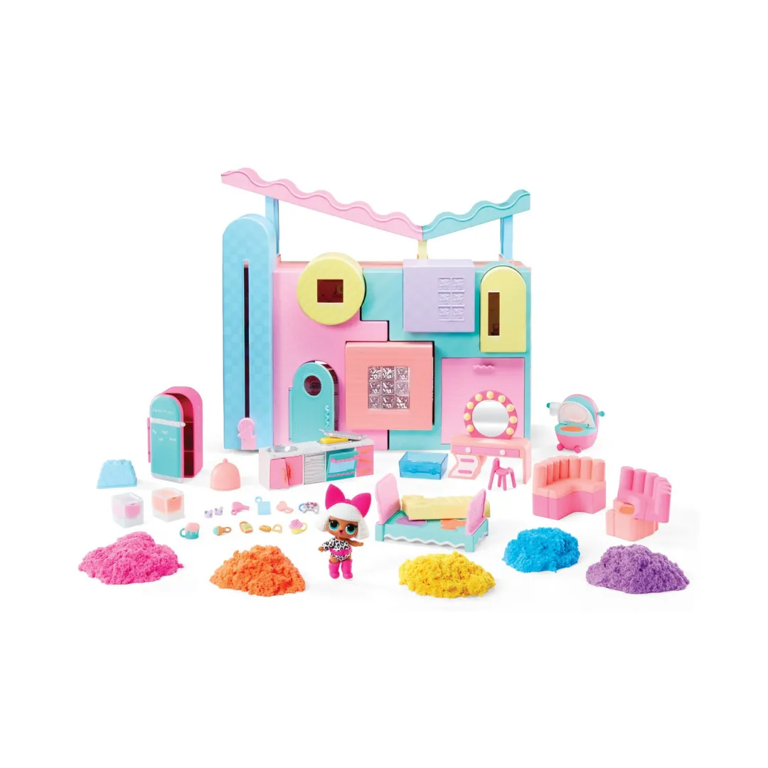 Esta casa se despliega para revelar seis áreas diferentes de juego, un ascensor funcional y una muñeca exclusiva LOL Surprise para comenzar la diversión desde el primer momento. La arena especial Squish Sand viene en distintos colores para mezclar, aplastar y reutilizar una y otra vez, sin secarse ni perder su textura suave.