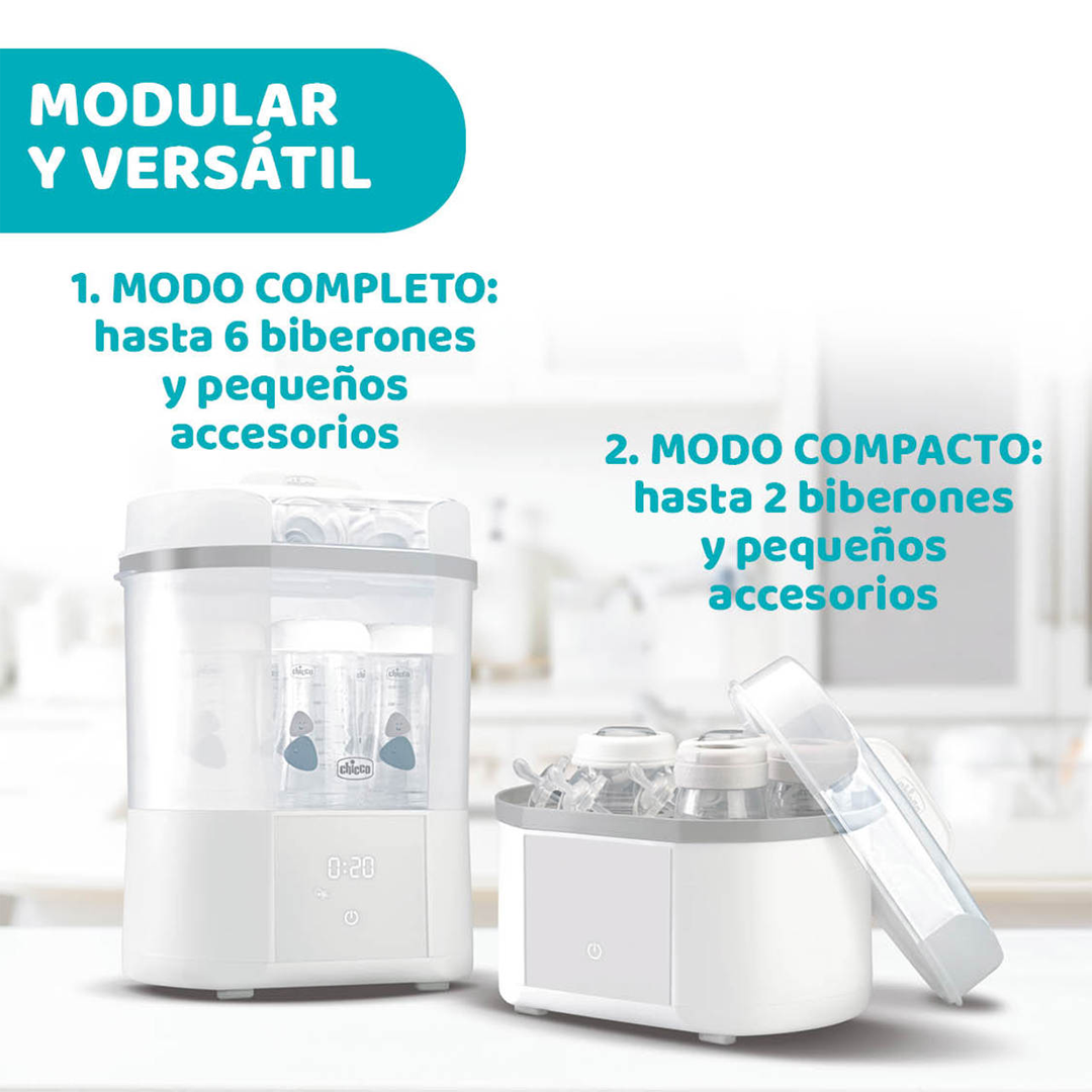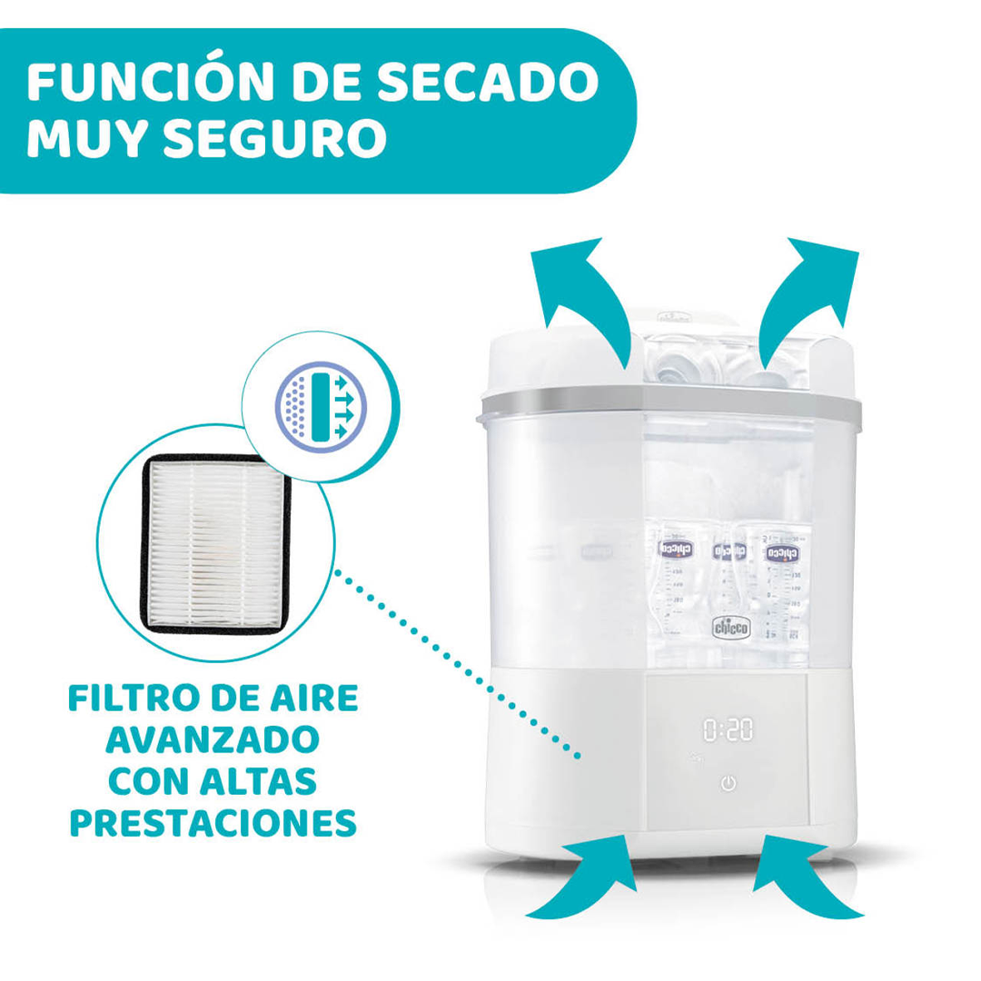 Diseñado para facilitar la rutina de los padres, este esterilizador es fácil de usar y compatible con la mayoría de los biberones y accesorios. Su tamaño compacto lo hace ideal para cualquier hogar, manteniendo los biberones y otros utensilios del bebé siempre limpios, secos y listos para la próxima toma. Con el Esterilizador con Secador Chicco, aseguras una higiene total con el mínimo esfuerzo.