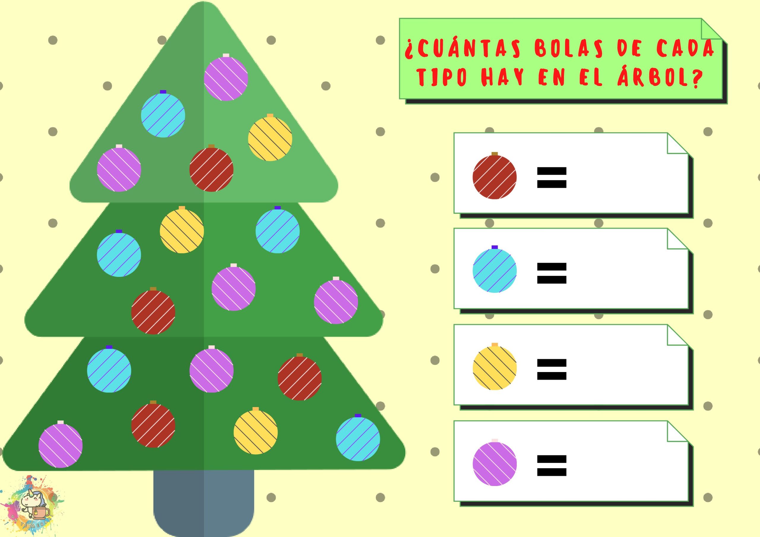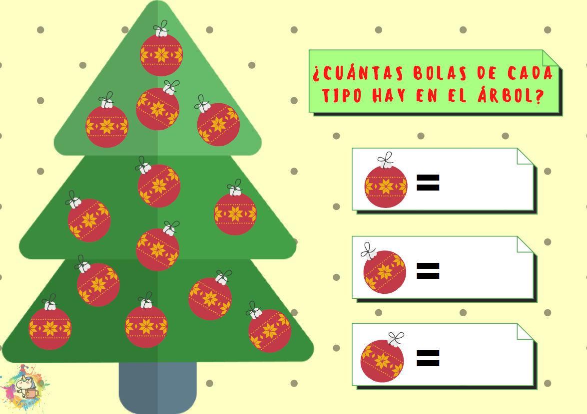 Cuatro láminas para trabajar el conteo con temática de navidad. Cuenta las bolas de cada modelo o tamaño y escríbelas en las casillas correspondientes.