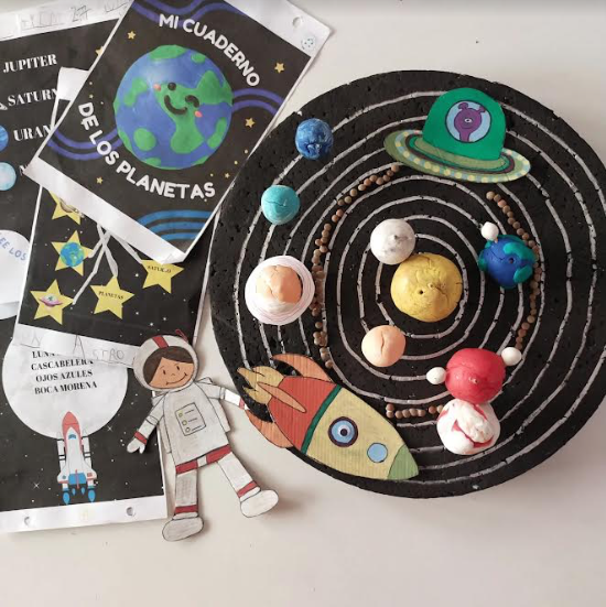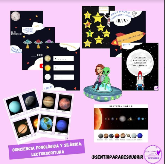 Este material consta de: un cuadernillo de 28 páginas, un pack de tarjetas de los planetas con el nombre en mayúsculas y un póster del sistema solar.