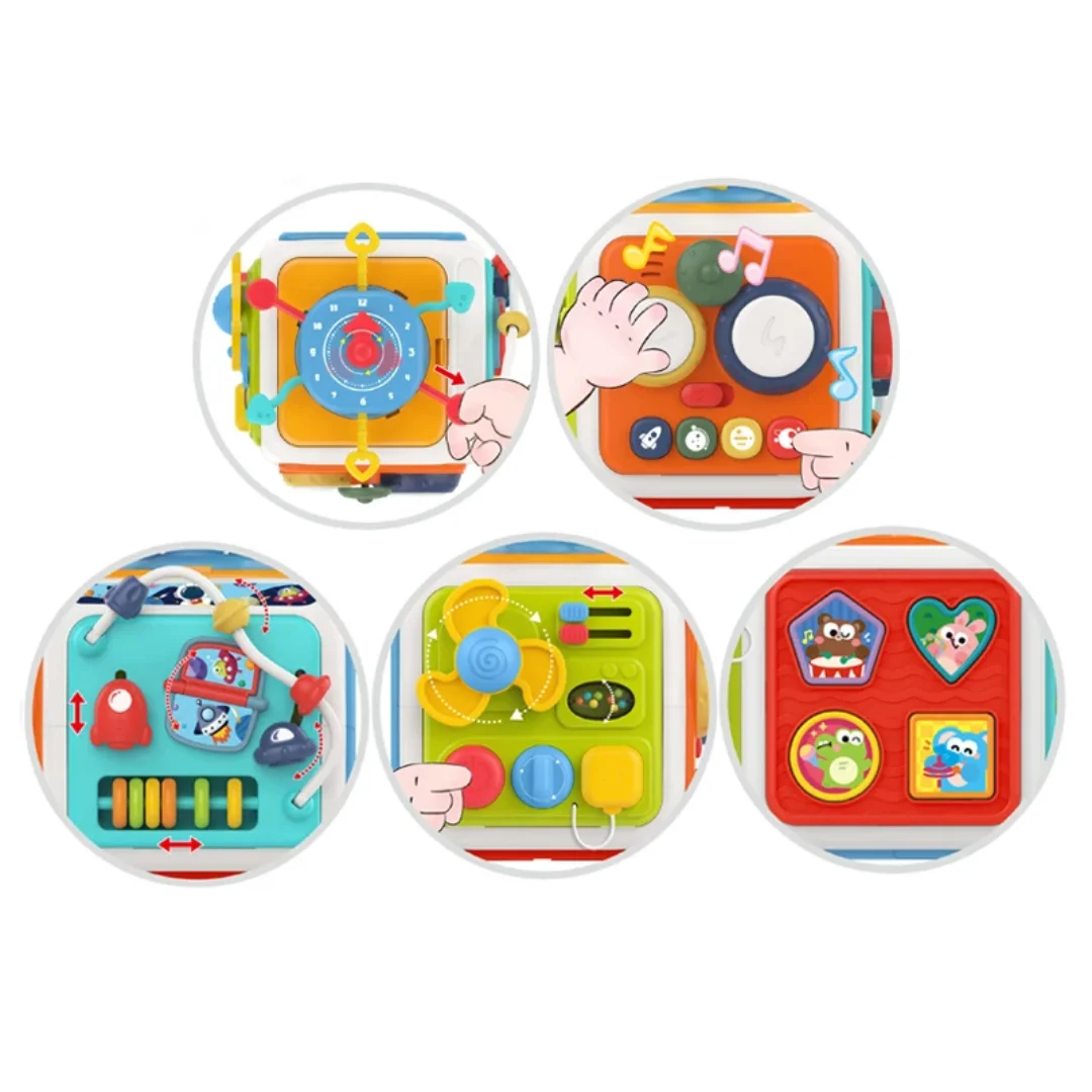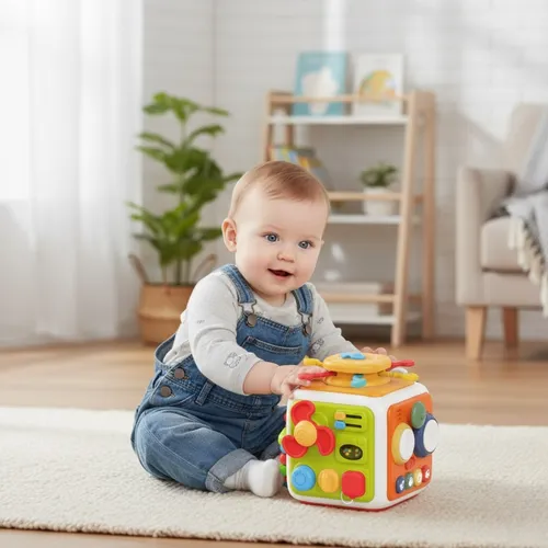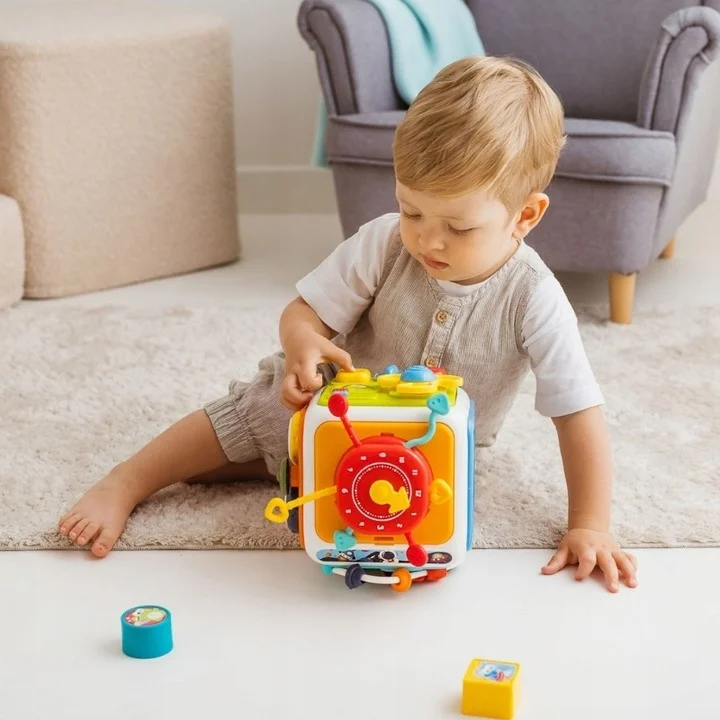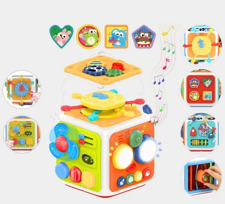Este cubo didáctico estimula la motricidad fina, la coordinación mano-ojo, el desarrollo sensorial, la lógica temprana y la comprensión de causa y efecto. Ideal para mantener a los pequeños entretenidos mientras aprenden.