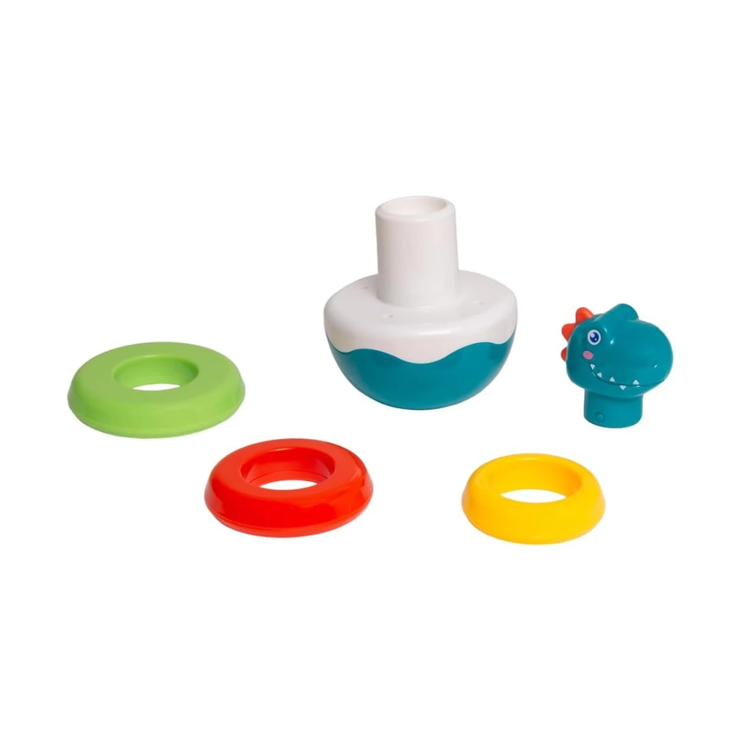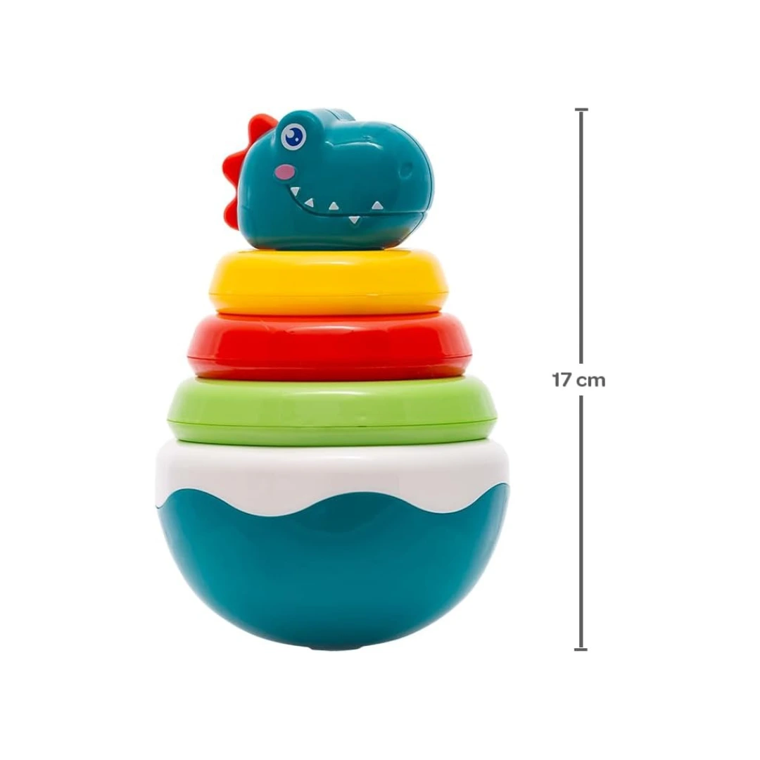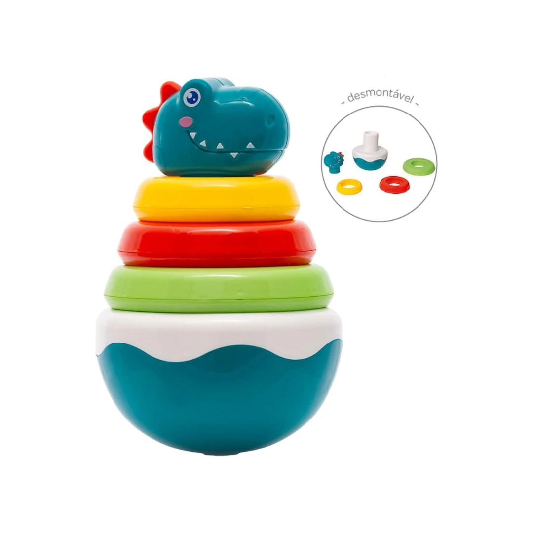 • Argollas Apilables: Incluye varias argollas de diferentes tamaños y colores que los niños pueden apilar en el cuello del dinosaurio. Este juego de apilamiento no solo es divertido, sino que también ayuda a desarrollar la coordinación mano-ojo y las habilidades motoras finas.