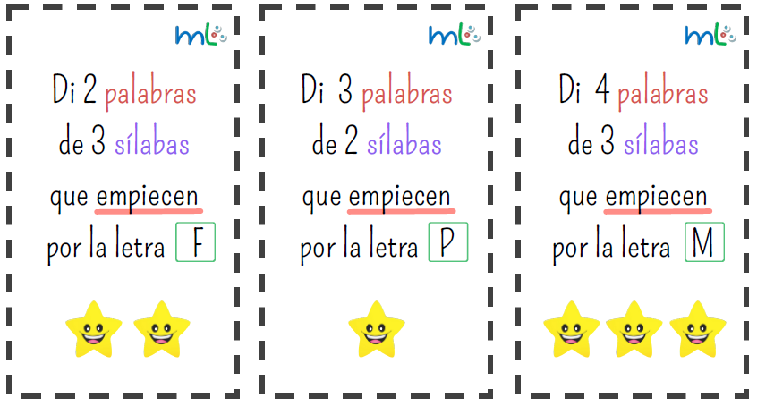 Con este juego iremos reforzando conciencia léxica, silábica y principio alfabético. Colocaremos las cartas bocabajo e iremos sacando una por turnos. Los jugadores que acierten, anotarán tantos puntos como estrellas haya en sus tarjetas. Gana el jugador que obtenga la máxima puntuación.