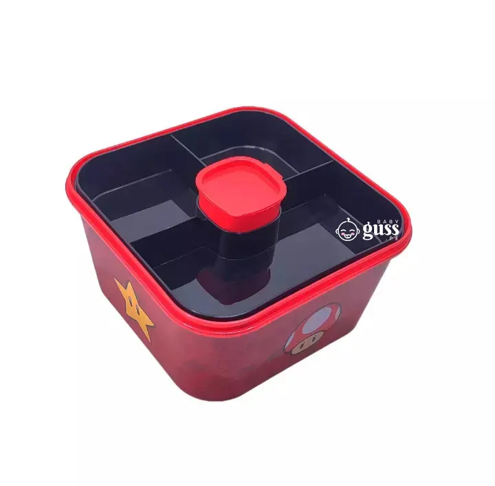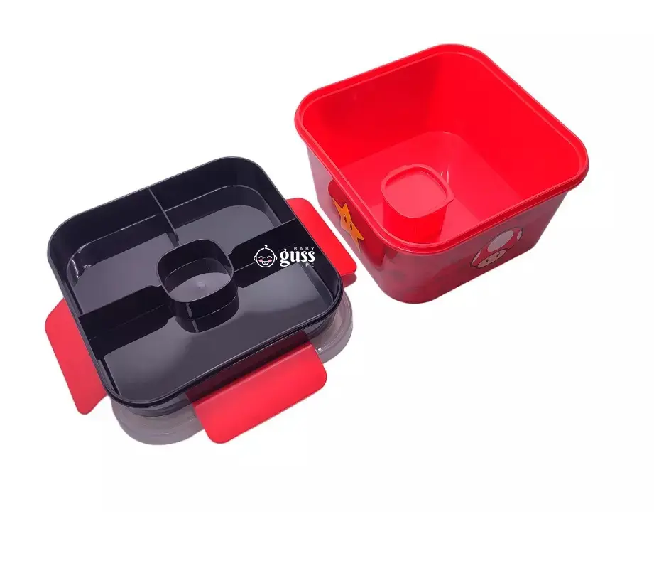 Original y práctica fiambrera con 5 compartimentos para plato principal, fruta, snacks o dip, todos separados para evitar mezclar sabores y olores. Ideal que lleven su almuerzo al parque, al colegio o en cualquier salida fuera de casa. Fabricado en material resistente y con cierre de seguridad. Decorado con atractivos diseños basados en los personajes principales de su serie favorita, los niños estarán encantados de llevárselo allá donde vayan.
