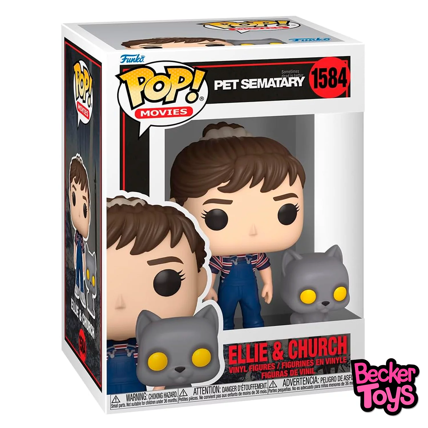 Esta figura pertenece a la línea POP! Movies y forma parte de la colección basada en la adaptación cinematográfica de Cementerio de animales. Ellie aparece con una expresión serena, vestida con ropa infantil, mientras que Church, el gato resucitado, se muestra con mirada penetrante y pelaje desaliñado. El contraste entre la dulzura de Ellie y la presencia perturbadora de Church crea una composición visual poderosa que evoca el tono siniestro de la historia.