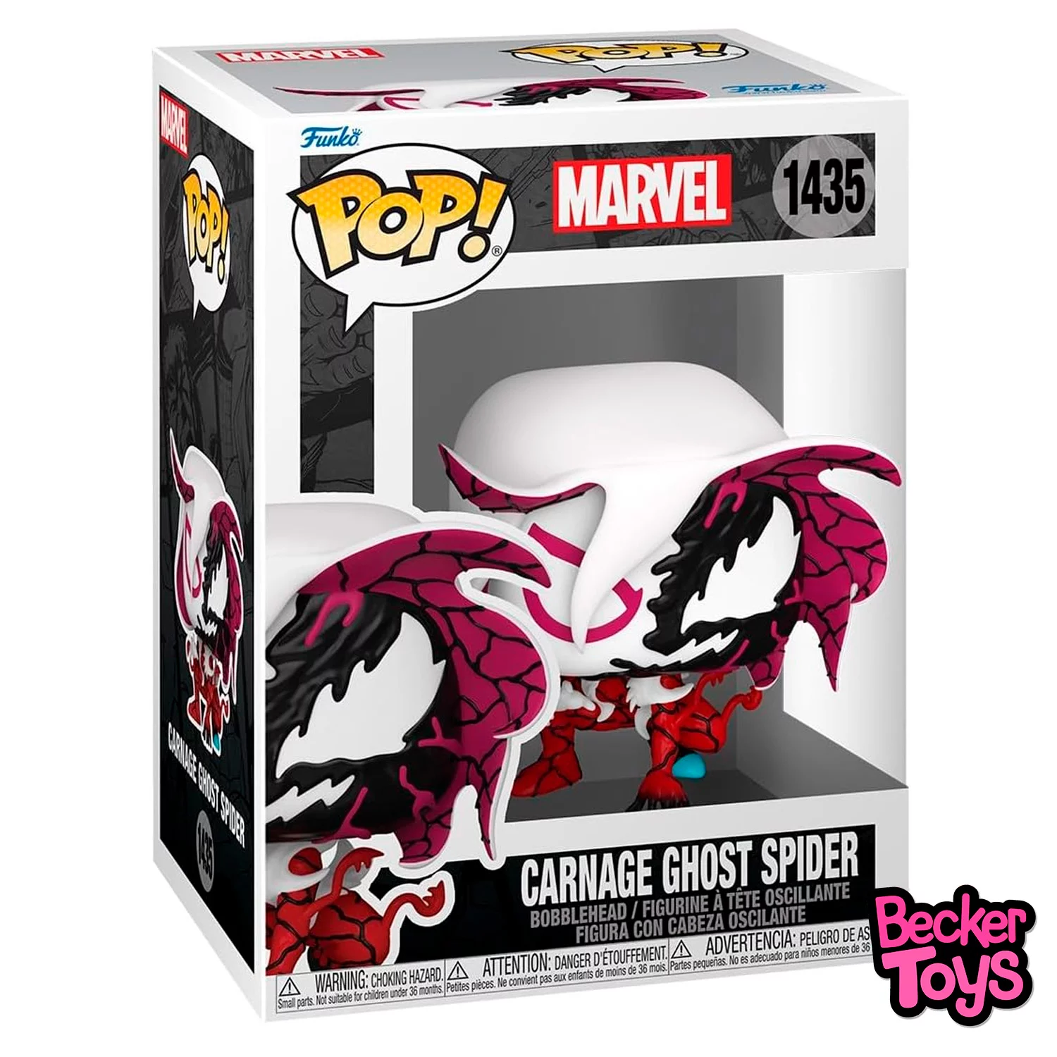 Funko POP! Marvel – Carnage Ghost Spider #1435 fusiona a Ghost-Spider (Gwen Stacy) con el simbionte Carnage, creando una figura feroz, estilizada y visualmente impactante. Es parte de la línea Carnageized, que reimagina héroes icónicos bajo la influencia del caos simbiótico.
