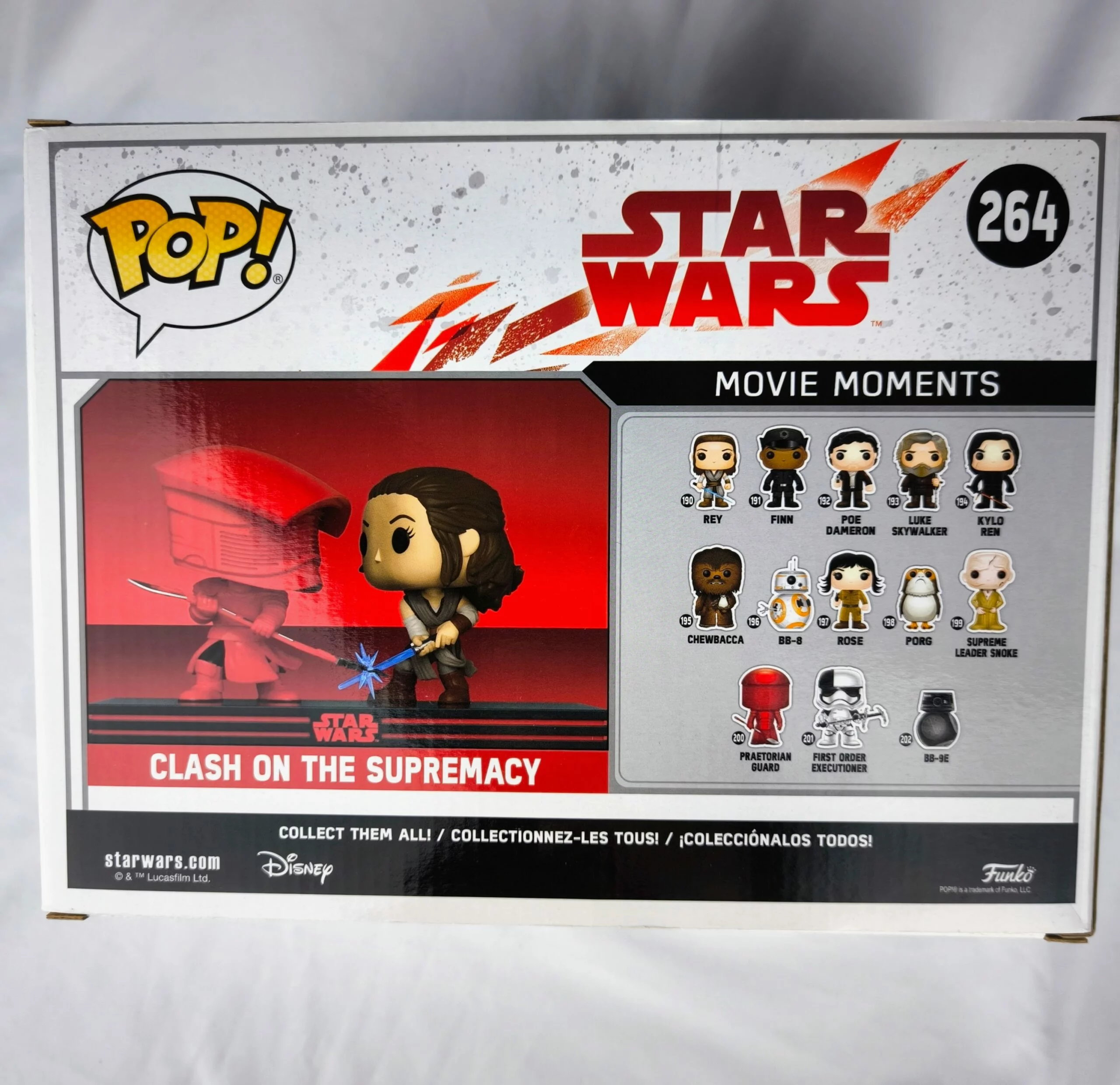 Funko Pop! Star Wars Clash On The Supremacy #264 es parte de la línea Movie Moments, capturando una escena icónica de Star Wars: The Last Jedi. Representa el enfrentamiento entre Rey y los Guardias Pretorianos a bordo del Supremacy, la nave insignia de la Primera Orden.