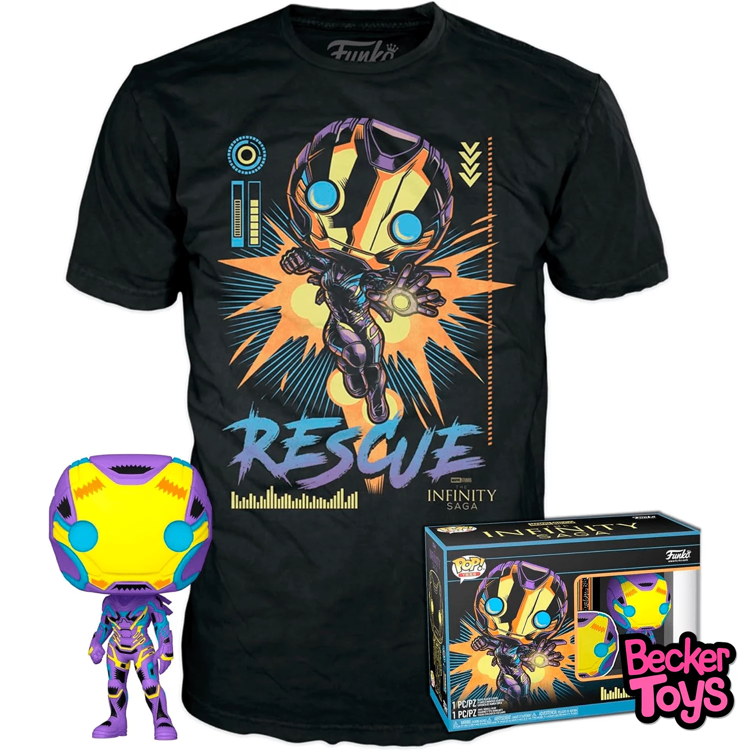 Funko Pop! & tee: Marvel Blacklight – Rescue. Este conjunto incluye una figura de vinilo coleccionable y una camiseta inspirada en el personaje Rescue del universo Marvel.