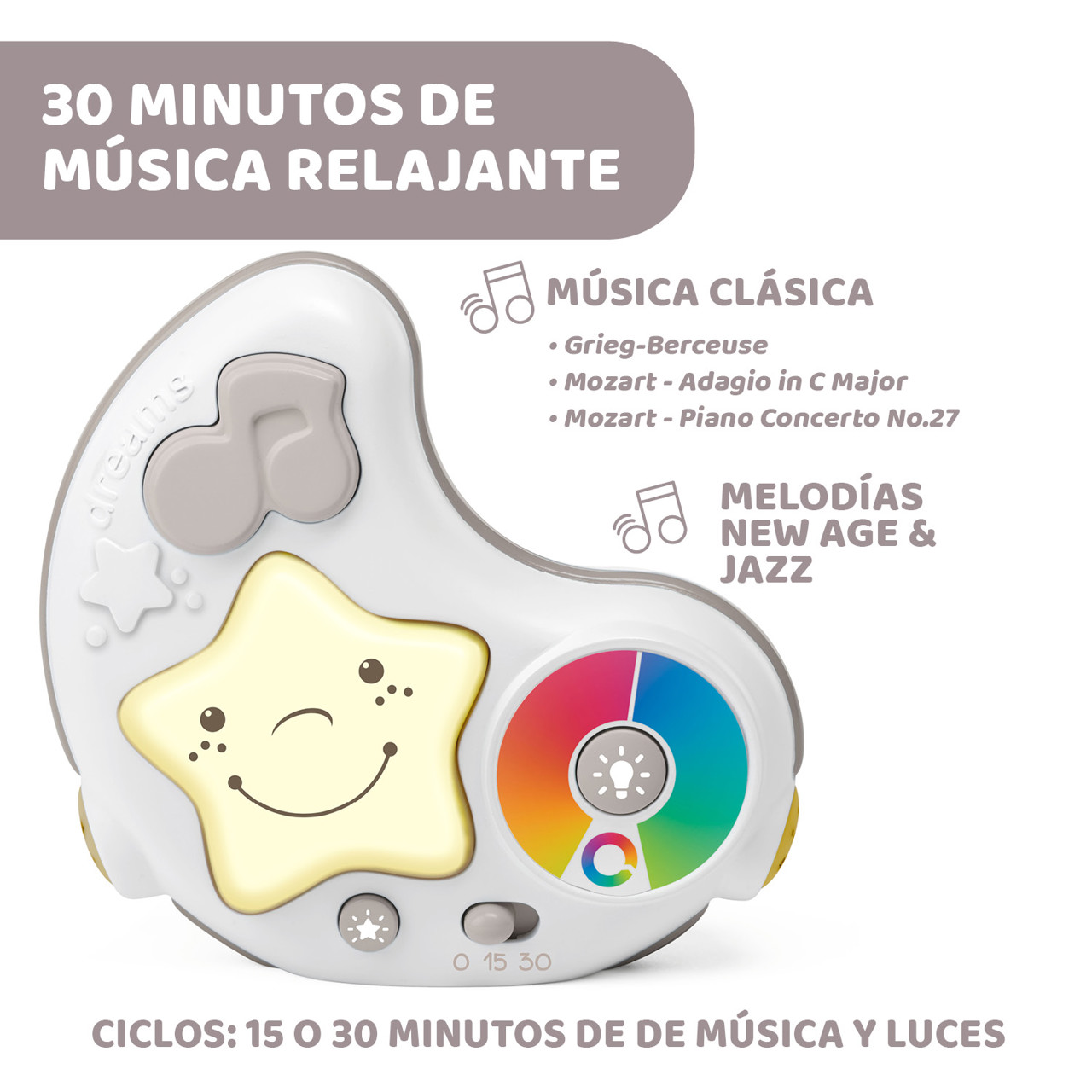 - Panel electrónico: La luz nocturna en forma de luna es extraíble y reproduce melodías con estrellas proyectadas de cambian de color automáticamente. Las luces y la música se pueden activar por separado.