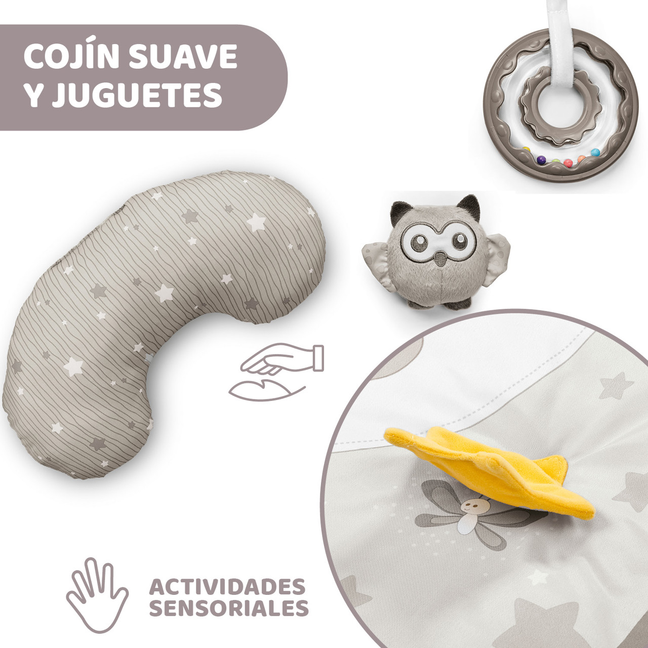- Incluye: 1x Gimnasio de juegos, 1x almohada, 2x colgantes textiles, 1x sonajero de plástico con anillo, y 1x sonajero textil.
