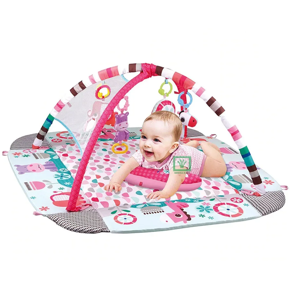 Este gimnasio de bebé proporciona mucha diversión. Tiene dos barras de protección y cuatro juguetes diferentes y de actividad colgando de ellos. Estos juguetes para estimulación visual pueden fomentar el desarrollo visual del bebé. Cuando los bebés comienzan a alcanzar los juguetes, agarra y da patadas a los juguetes interesantes, estos movimientos hacen que los juguetes se balanceen, se mezclan y sonajero, lo que crea una estimulación más visual y auditiva. La bolsa de almacenamiento con forma de cabeza de tortuga atrapa las pelotas.