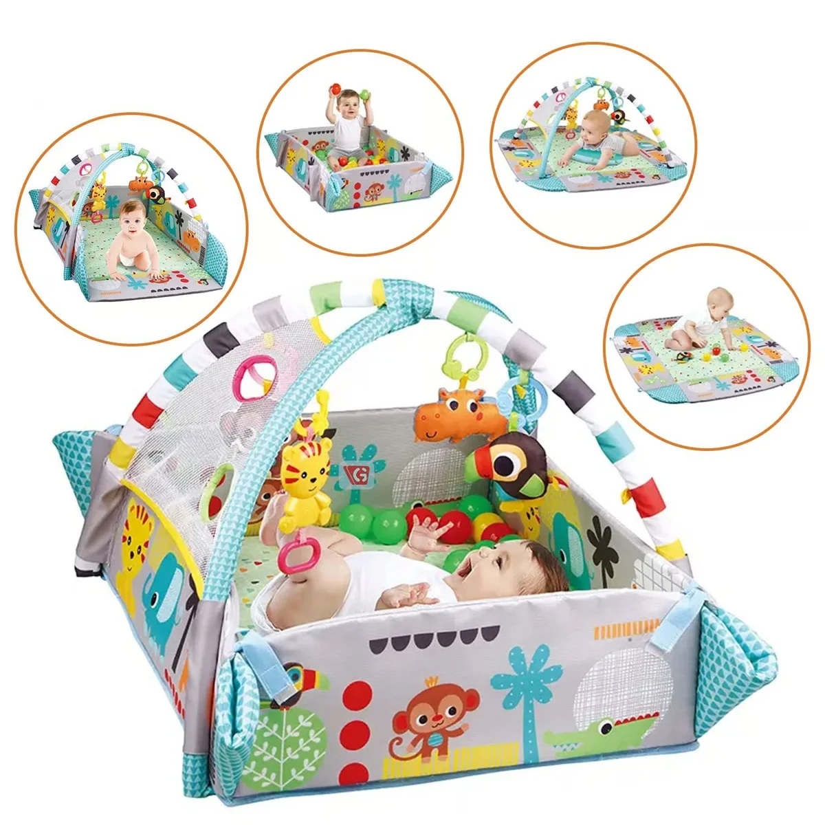 Este gimnasio de bebé proporciona mucha diversión. Tiene dos barras de protección y cuatro juguetes diferentes y de actividad colgando de ellos. Estos juguetes para estimulación visual pueden fomentar el desarrollo visual del bebé. Cuando los bebés comienzan a alcanzar los juguetes, agarra y da patadas a los juguetes interesantes, estos movimientos hacen que los juguetes se balanceen, se mezclan y sonajero, lo que crea una estimulación más visual y auditiva. La bolsa de almacenamiento con forma de cabeza de tortuga atrapa las pelotas.