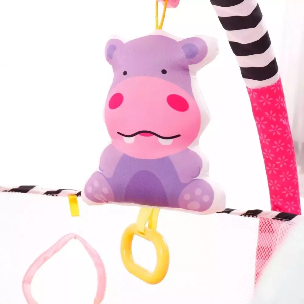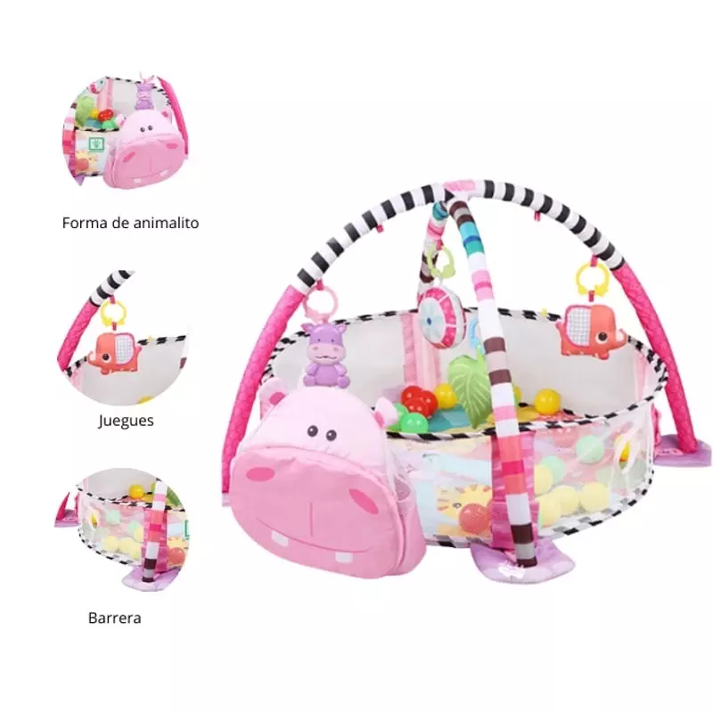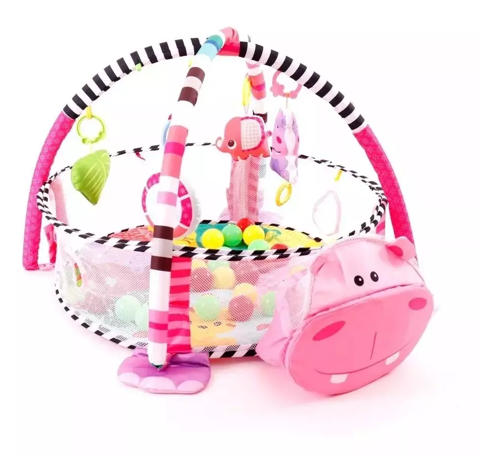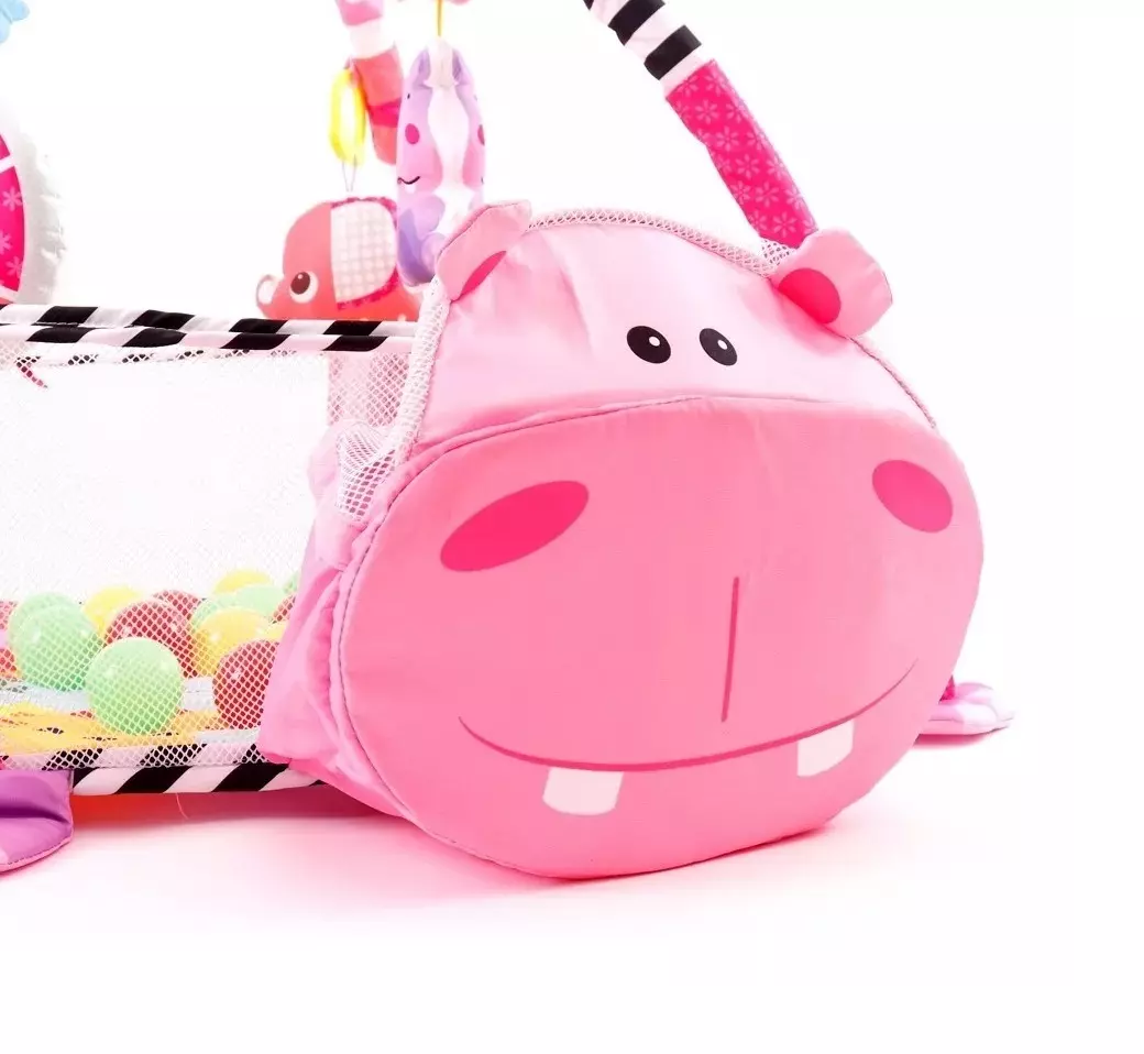 Elementos incluidos: 1 Gimnasio Modelo Hipopótamo 3 en 1, se convierte en piscina de pelotas e incluye 30 pelotas de plástico, 4 juguetes colgadores.
