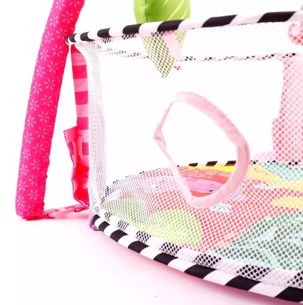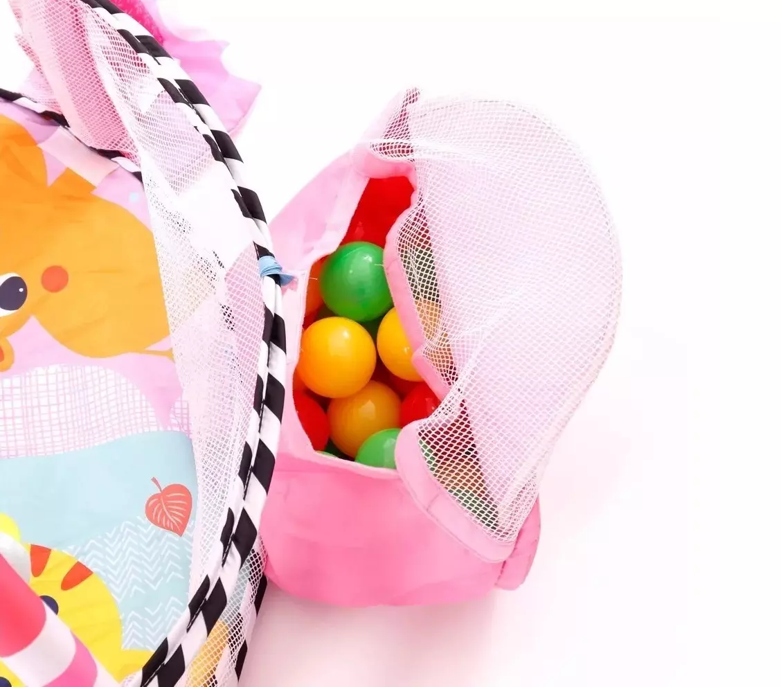 Este gimnasio de bebé proporciona mucha diversión. Tiene dos barras de protección y cuatro juguetes diferentes y de actividad colgando de ellos. Estos juguetes para estimulación visual pueden fomentar el desarrollo visual del bebé. Cuando los bebés comienzan a alcanzar los juguetes, agarra y da patadas a los juguetes interesantes, estos movimientos hacen que los juguetes se balanceen, se mezclan y sonajero, lo que crea una estimulación más visual y auditiva. La bolsa de almacenamiento con forma de cabeza de tortuga atrapa las pelotas.