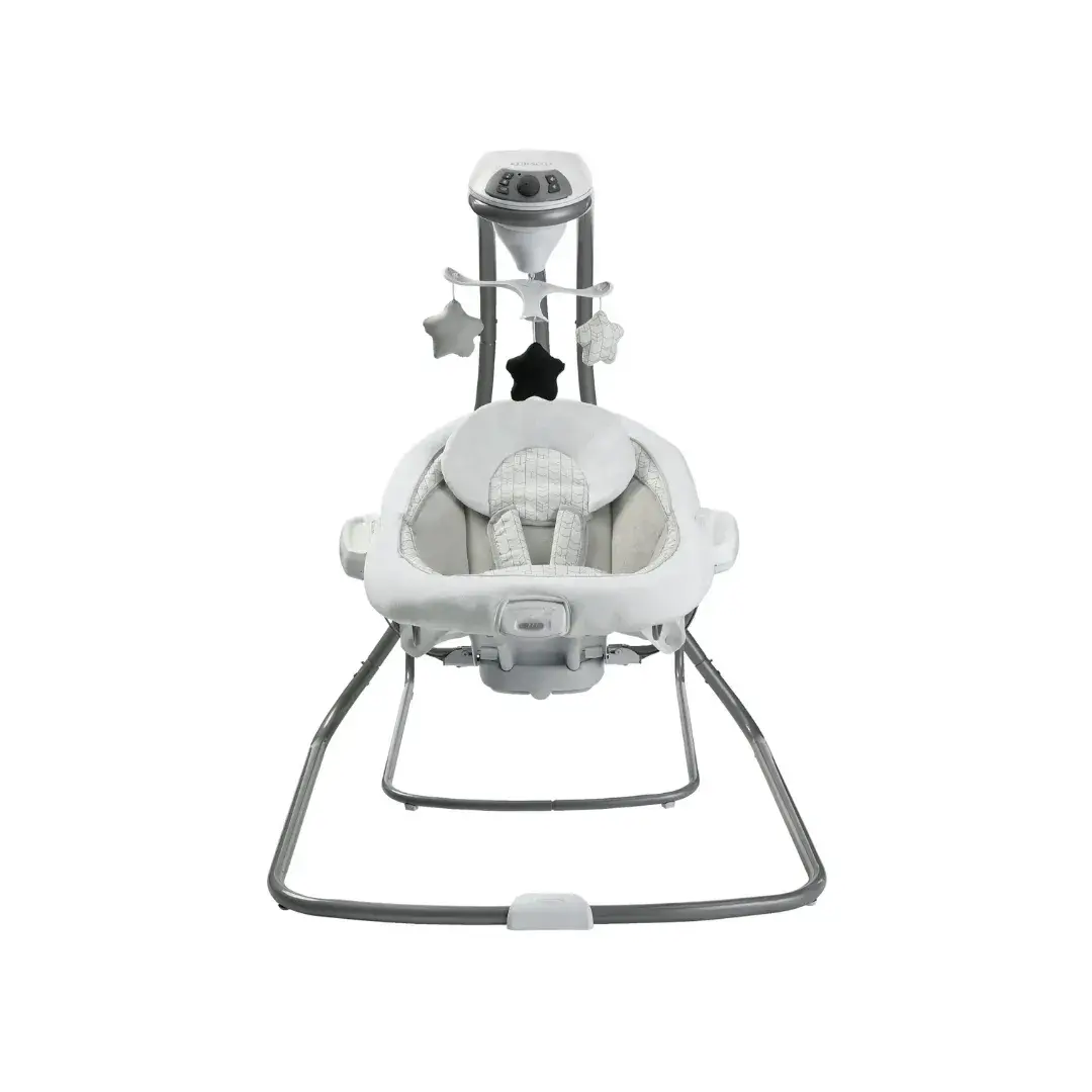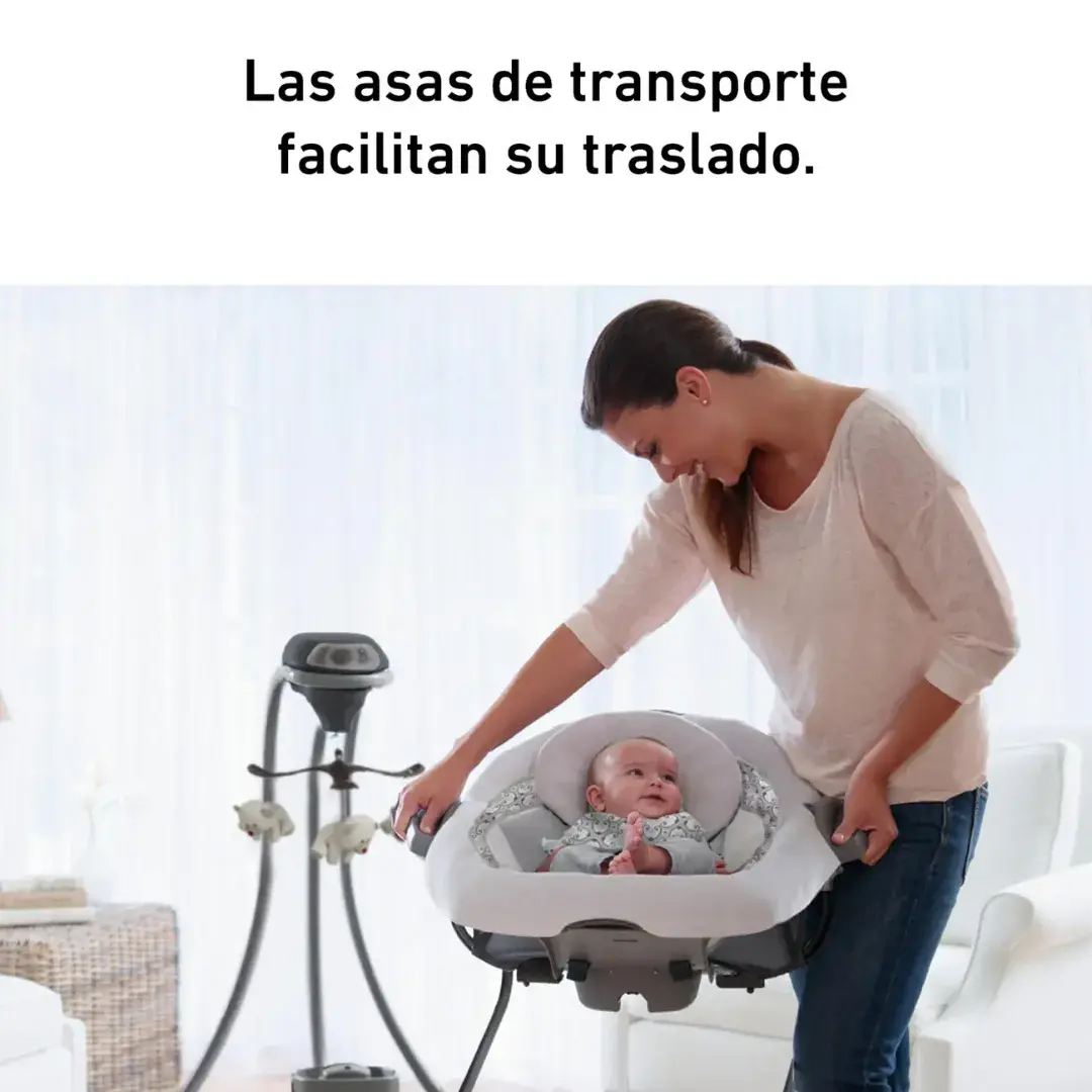 - La hamaquita cuenta con un suave movimiento de balanceo y un asiento de 3 posiciones para balancearse de lado a lado o de adelante hacia atrás.