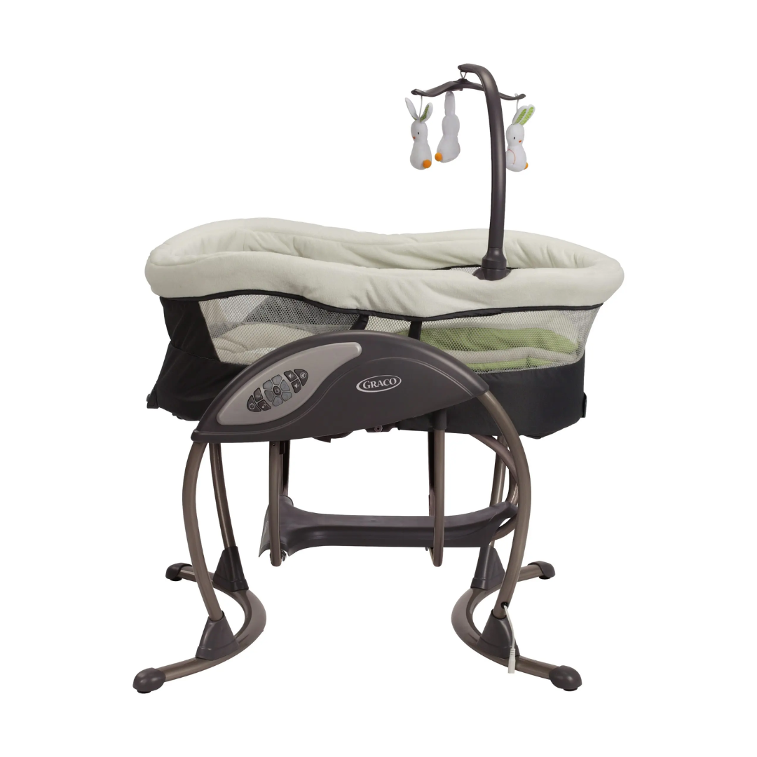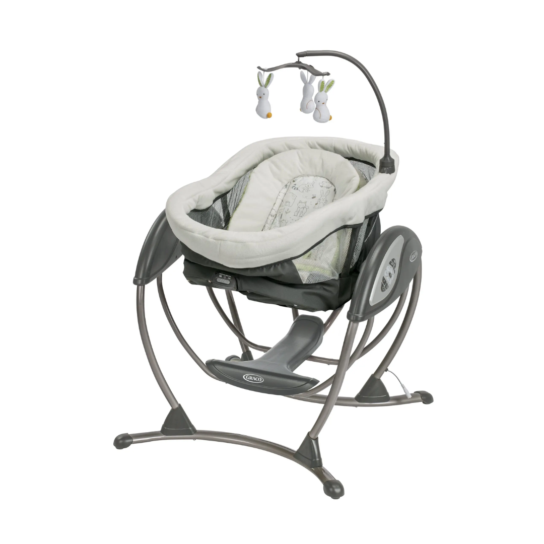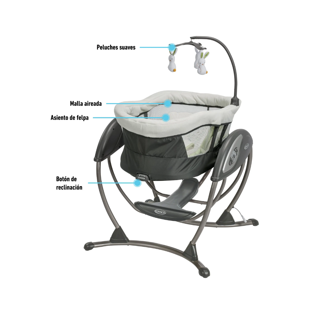 - El DuoGlider utiliza el mismo movimiento suave como si fuera que los estes meciendo con tus propias manos, también cuenta con vibración de dos velocidades, seis velocidades de oscilación, melodías clásicas y sonidos de la naturaleza, entre otros, para mantener al bebé calmado y cómodo.