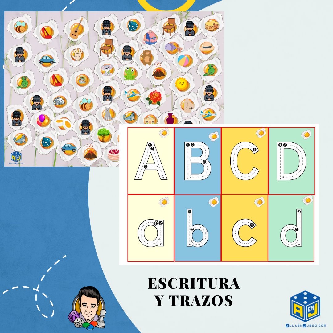 Vamos a trabajar el abecedario y los trazos… pero para que no sea tan aburrido le incluimos un poquito de juego con un tablero molón de conceptos, un dado y un tablerito individual.