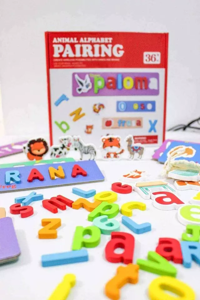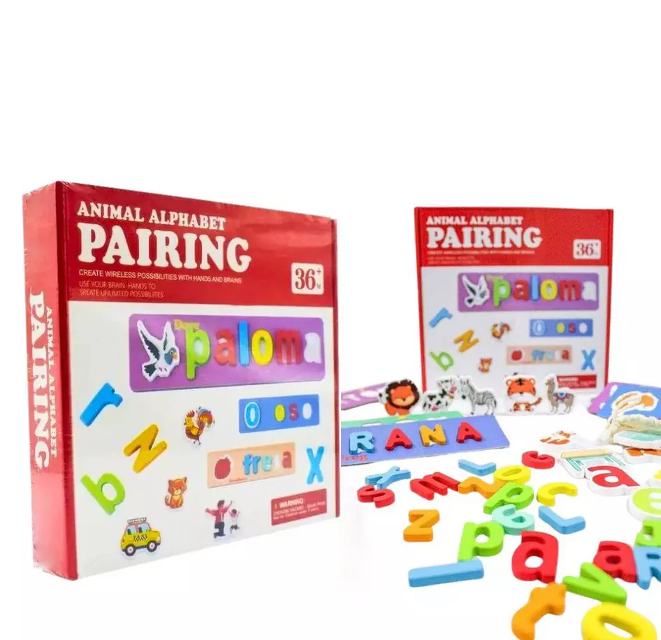 • 18 cartillas (doble lado) un total de 36 imágenes diferentes para poder encajar las letras de madera, formando sus nombres correctamente y emparejar con su animalito respectivo.