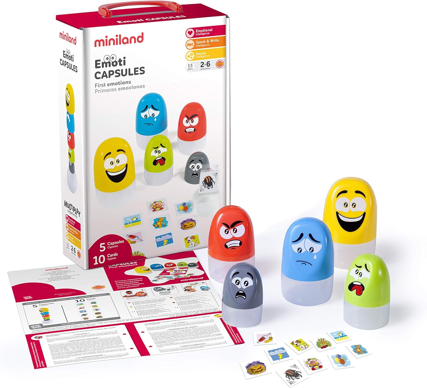 Cápsulas que representan las emociones básicas, que ayudan a conocer y gestionar las propias emociones. Los participantes introducen las tarjetas de juego, que muestran situaciones cotidianas, o fotos, dibujos u otros objetos en las cápsulas cuyo estado de ánimo que les sugiere. Permite el juego de forma individual o colectiva y se pueden guardar como una matrioska.