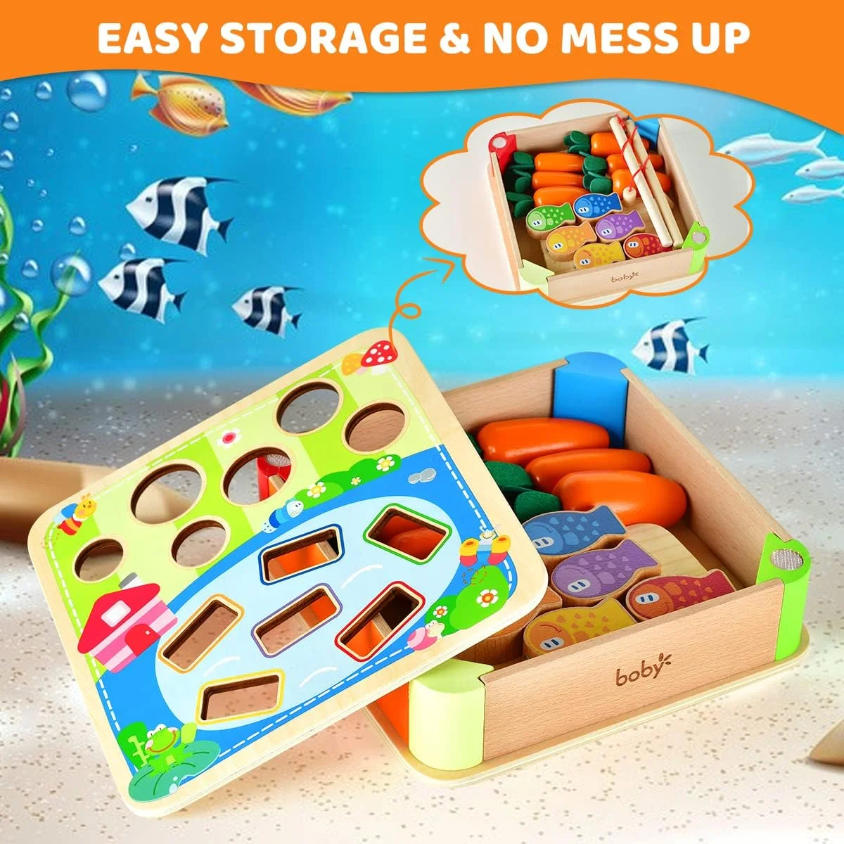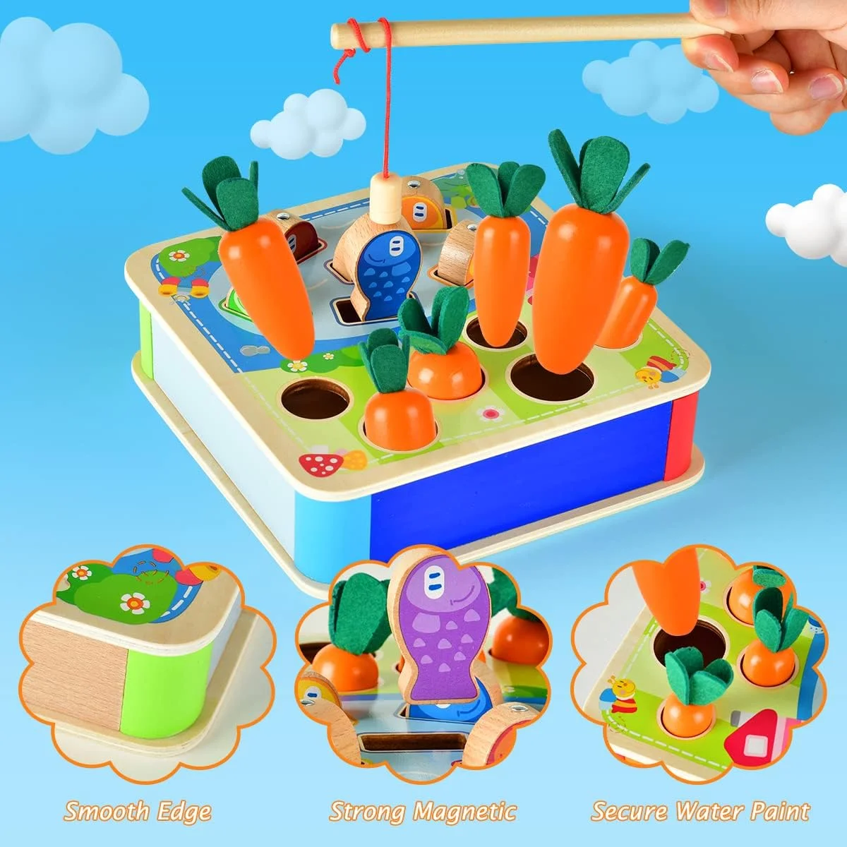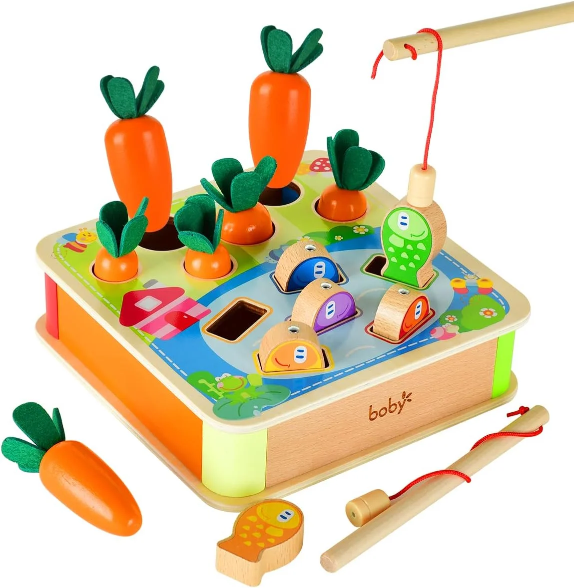 Haz que el aprendizaje sea divertido con este encantador juego Montessori 2 en 1. Ideal para niños pequeños en edad preescolar, este juguete educativo combina actividades de cosecha de zanahorias y pesca magnética, diseñadas para estimular el desarrollo temprano a través del juego interactivo.