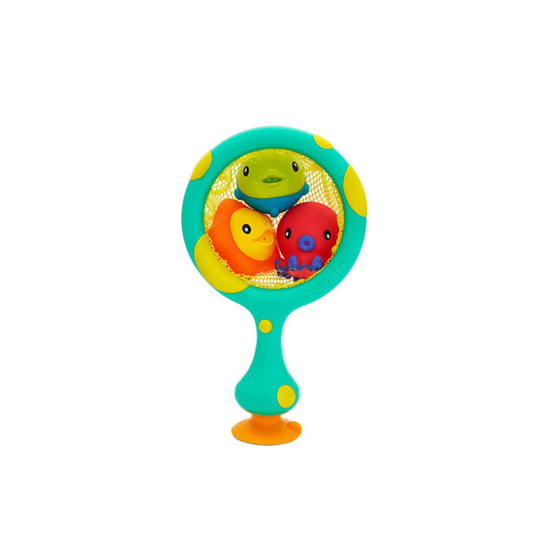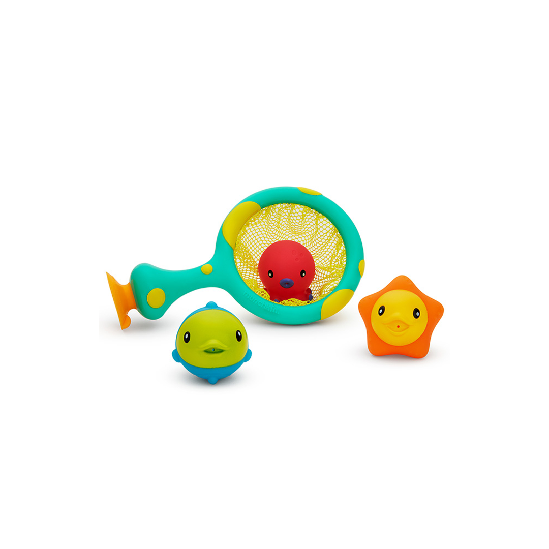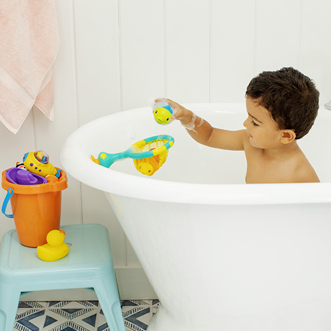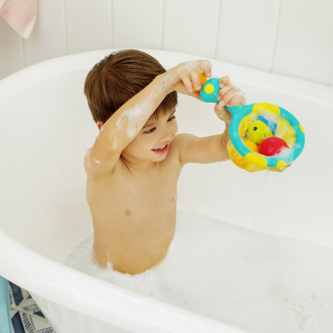- Dos divertidos juguetes de baño en uno: «Scoop and catch» y baloncesto. Ideal para niños y niñas de 12 meses en adelante.